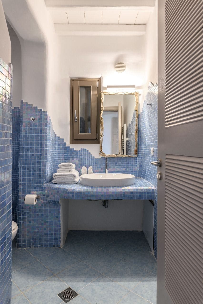 The villa’s outdoor areas are nothing short of spectacular. A lagoon-like swimming pool beckons you to take a refreshing dip, while the expansive terrace offers various seating areas under macrame parasols and a bamboo pergola. Enjoy outdoor dining with the Aegean as your backdrop, or retreat to the rooftop terrace for a private taverna experience with panoramic sunset views.
