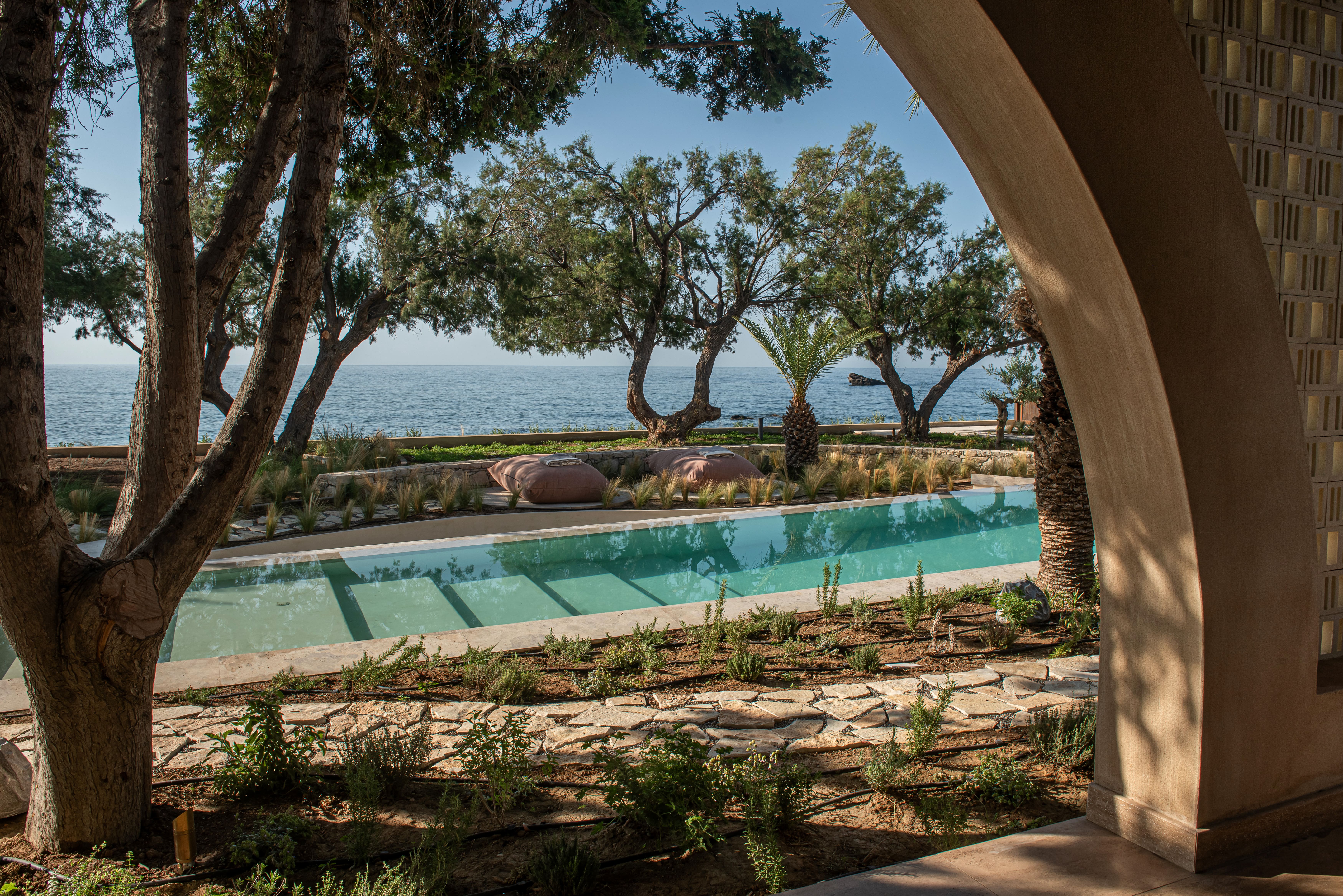 The outdoor areas are designed for relaxation and enjoyment, featuring a trio of inviting swimming pools and sun-kissed terraces with panoramic seaviews. Enjoy al fresco dining with a backdrop of the Cretan coastline, or simply unwind with a good book as the gentle sea breeze envelops you. The proximity to the beach means you can enjoy the sun and sand just a short stroll away.
