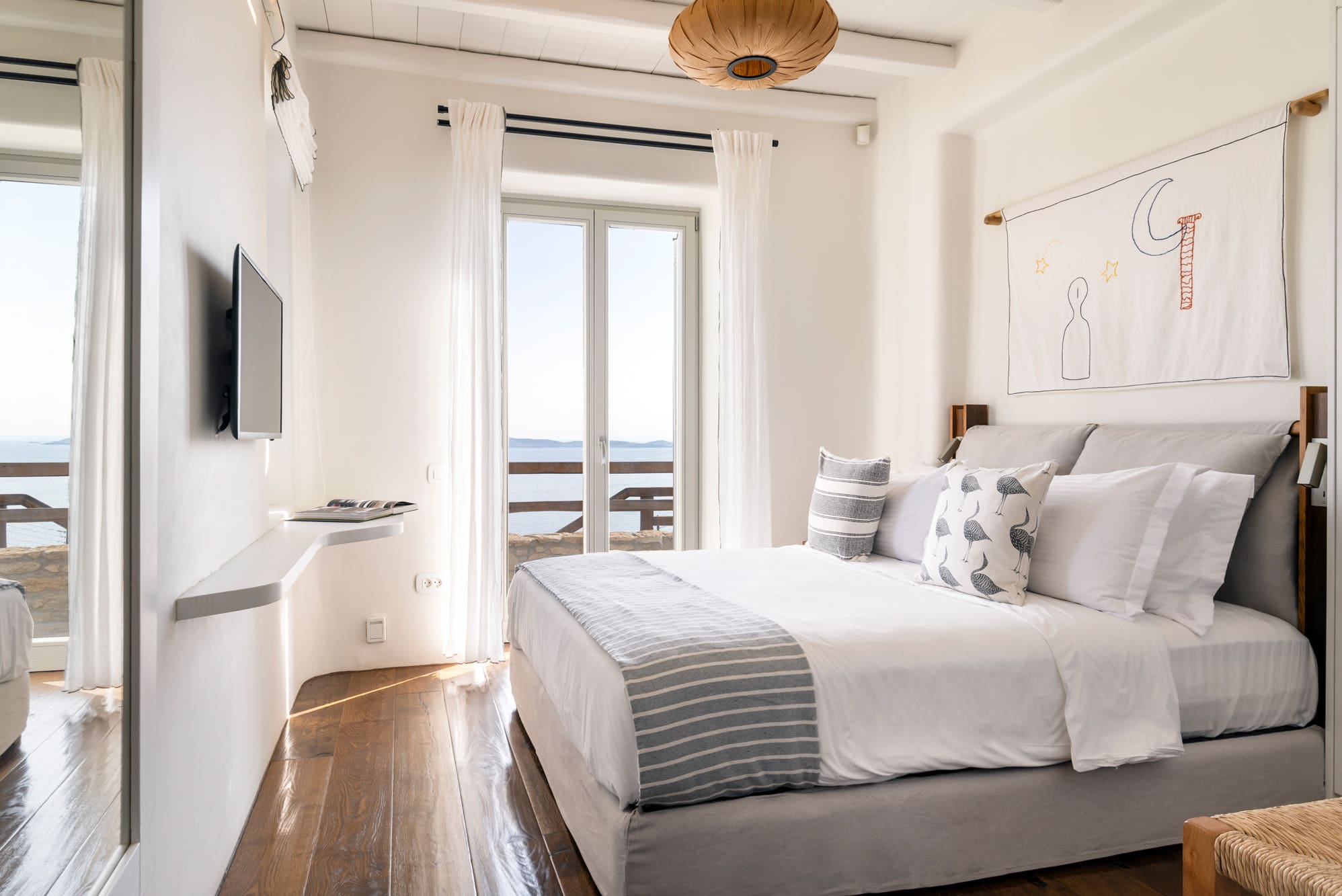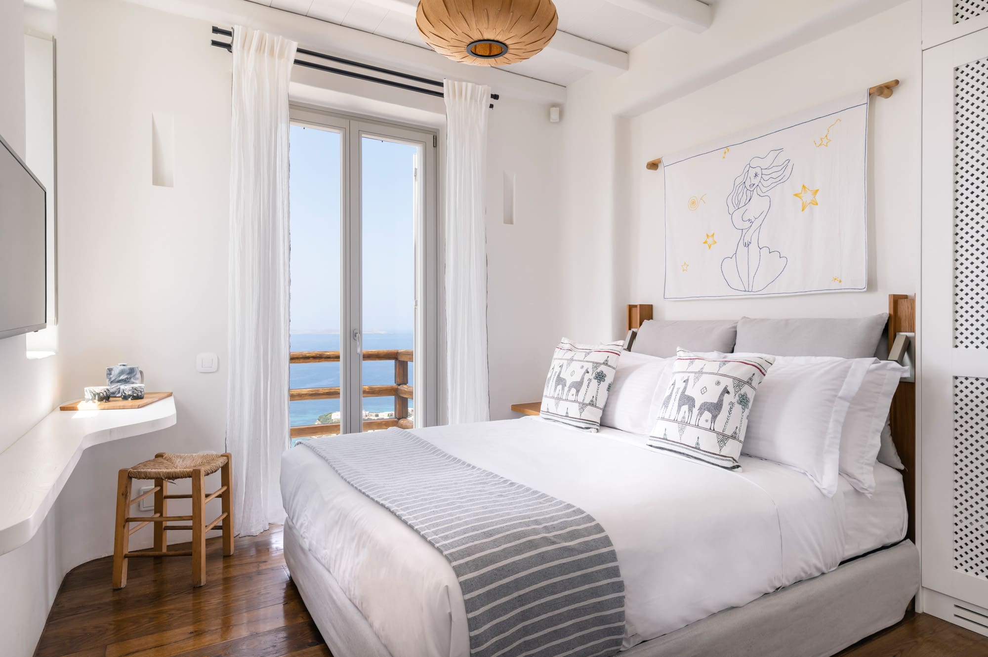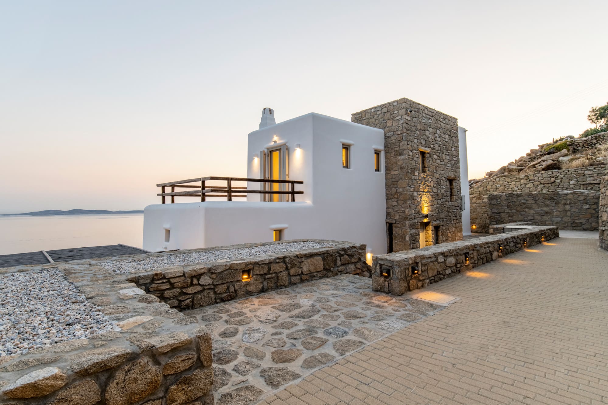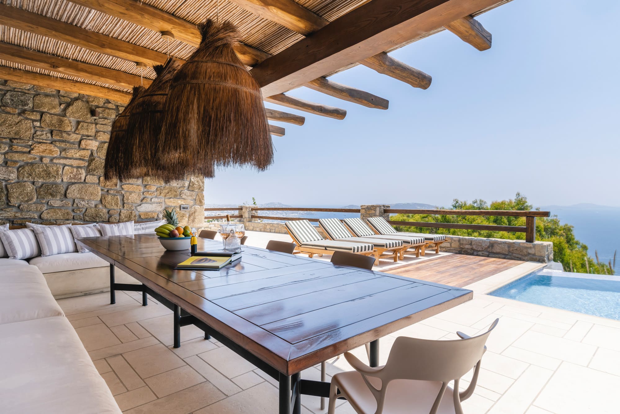 The outdoor area is a true haven for relaxation and entertainment. Dive into the sparkling swimming pool or unwind on sun-drenched terraces that provide panoramic views of the azure waters. Enjoy alfresco dining under the stars and soak in the serene atmosphere of Mykonos.