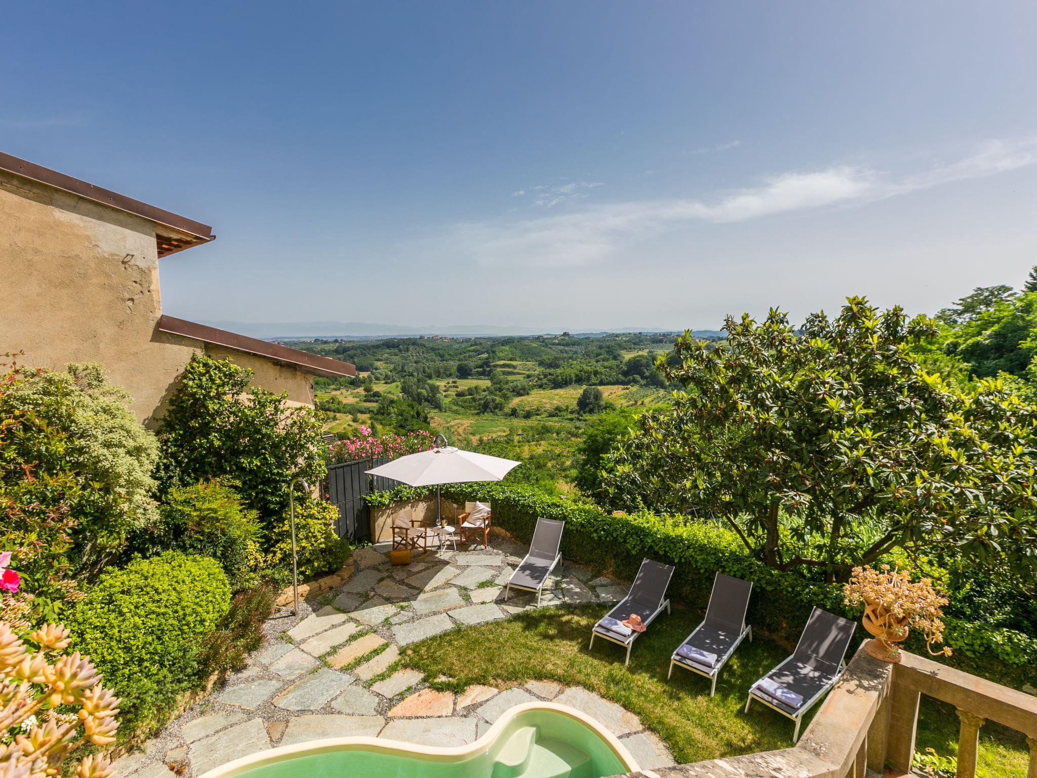 The villa’s 500 square metre fenced garden provides complete privacy and security, centred around a stunning kidney-shaped swimming pool measuring 5 by 3 metres with a depth of 140 centimetres. Available from May through September, the pool area becomes the heart of outdoor entertainment during warmer months. A magnificent 30 square metre terrace offers elevated views across the Tuscan landscape, furnished for outdoor dining and relaxation.