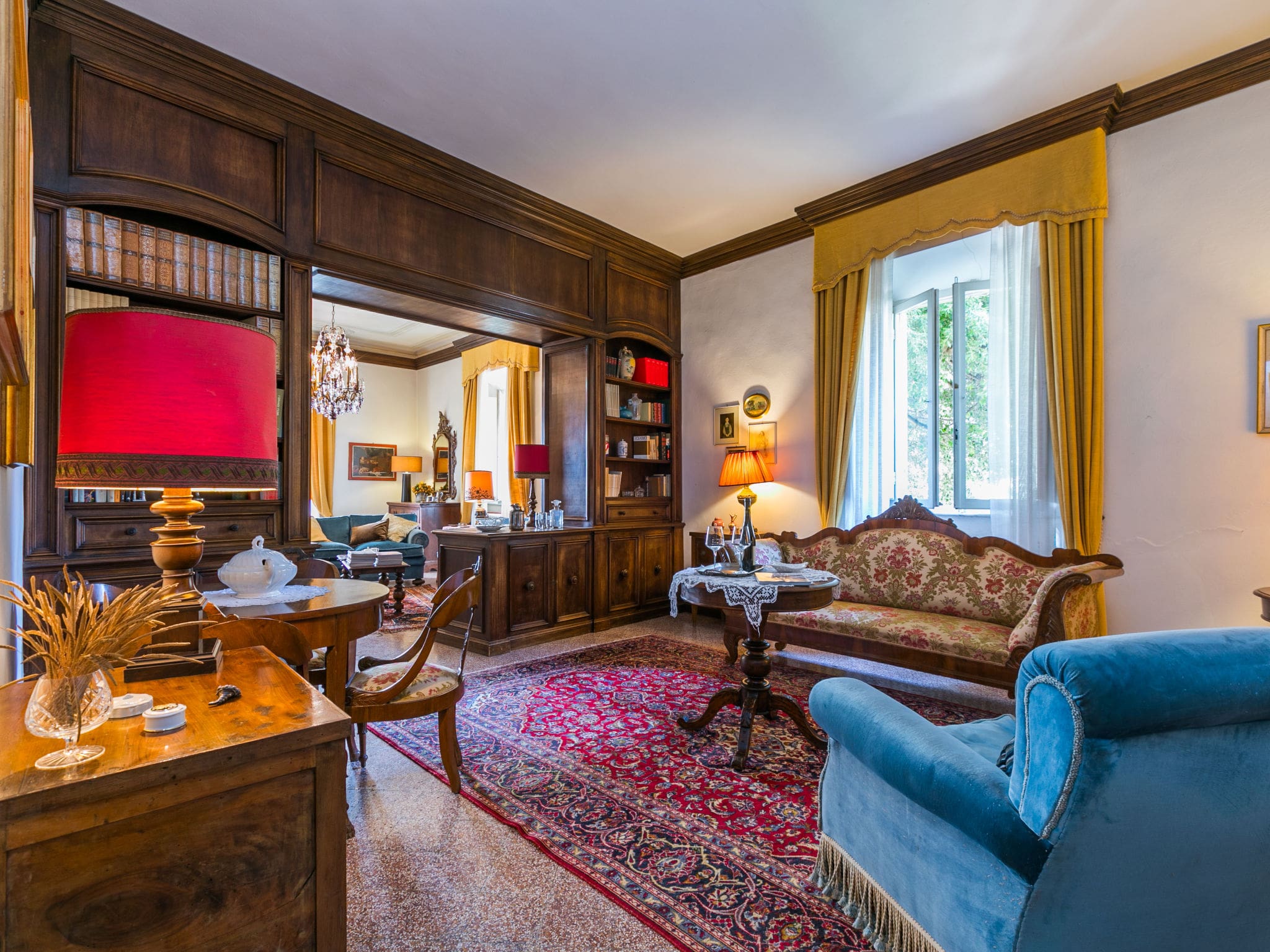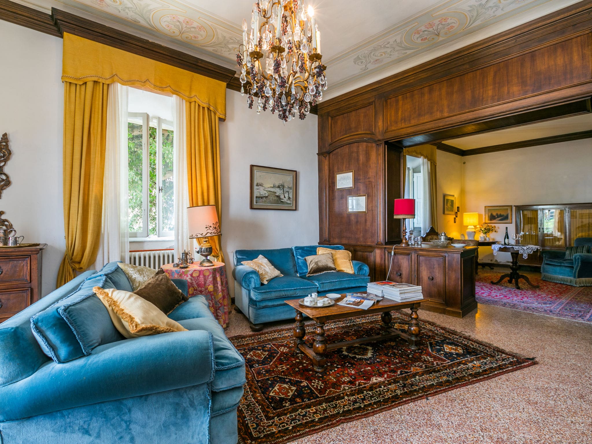 This remarkable three-storey villa spans 240 square metres of thoughtfully arranged living space, beginning with an impressive entrance hall that sets the tone for the refined atmosphere throughout. The ground floor features an open-plan living area perfect for gathering, while the large kitchen comes fully equipped with modern appliances including dishwasher, oven, and electric coffee machine. Original period details, including authentic frescoes and carefully preserved antique furnishings, create an atmosphere of timeless sophistication.