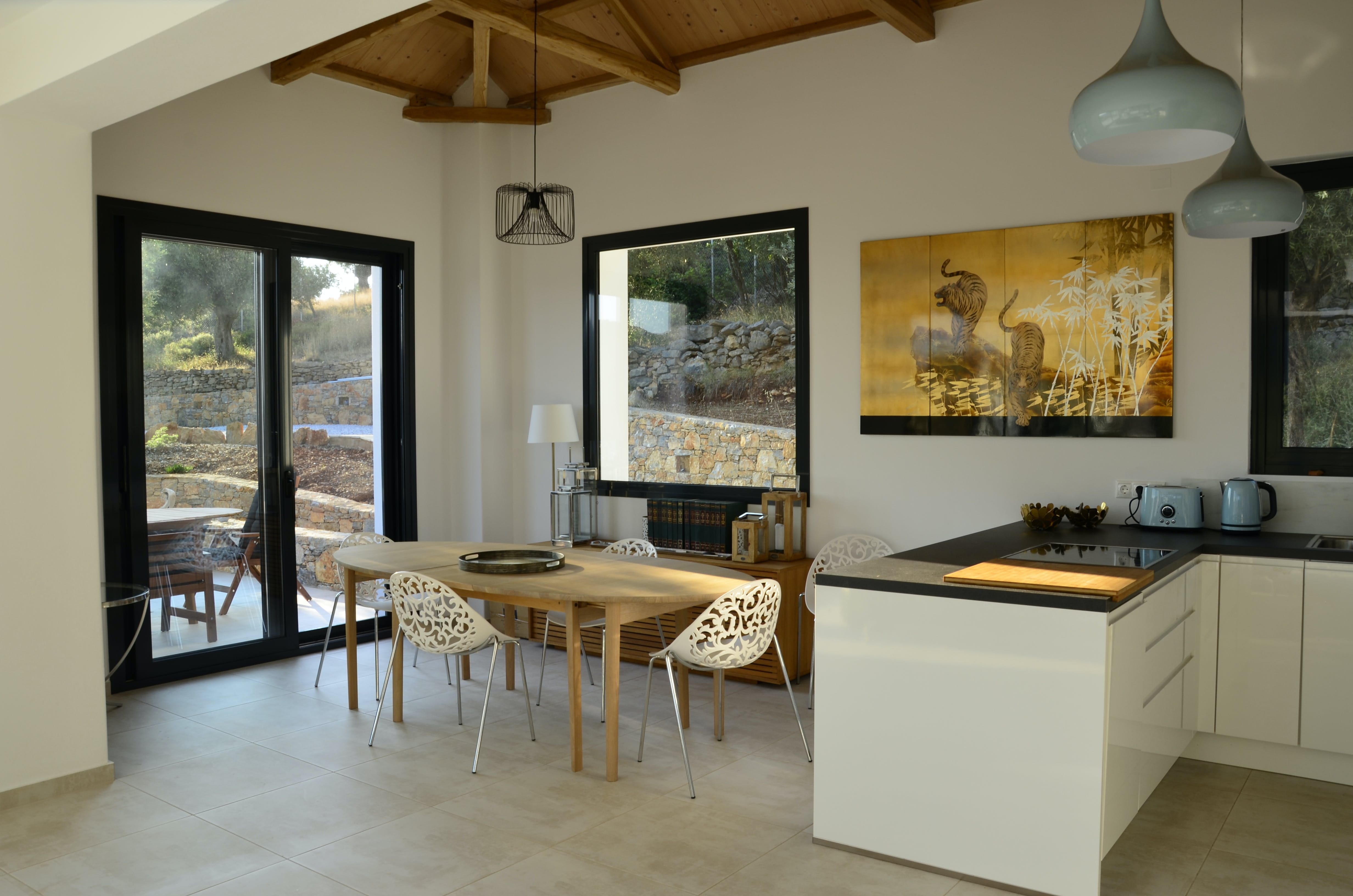 The villa comfortably hosts 8 guests across four bedrooms and three bathrooms. A car hire is recommended to explore the island fully, and caution is advised on the unpaved approach road. Pets and children are warmly welcomed, with practical amenities like linen changes and housekeeping provided twice a week. Browse our luxury villa rentals in Greece for more properties.
