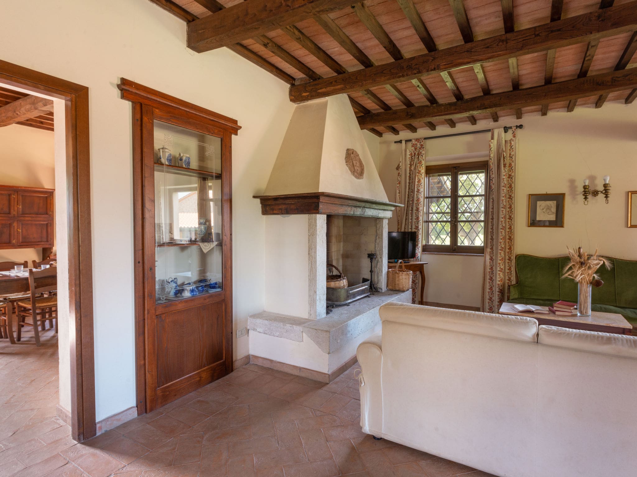Spanning 370 square metres across two thoughtfully designed levels, the property showcases the finest elements of traditional Tuscan architecture. The magnificent travertine stone staircase serves as the centrepiece, beautifully preserved during the careful renovation that respected both architectural heritage and local traditions. Natural stone floors flow throughout the villa, creating an authentic ambiance enhanced by comfortable country-style furnishings.