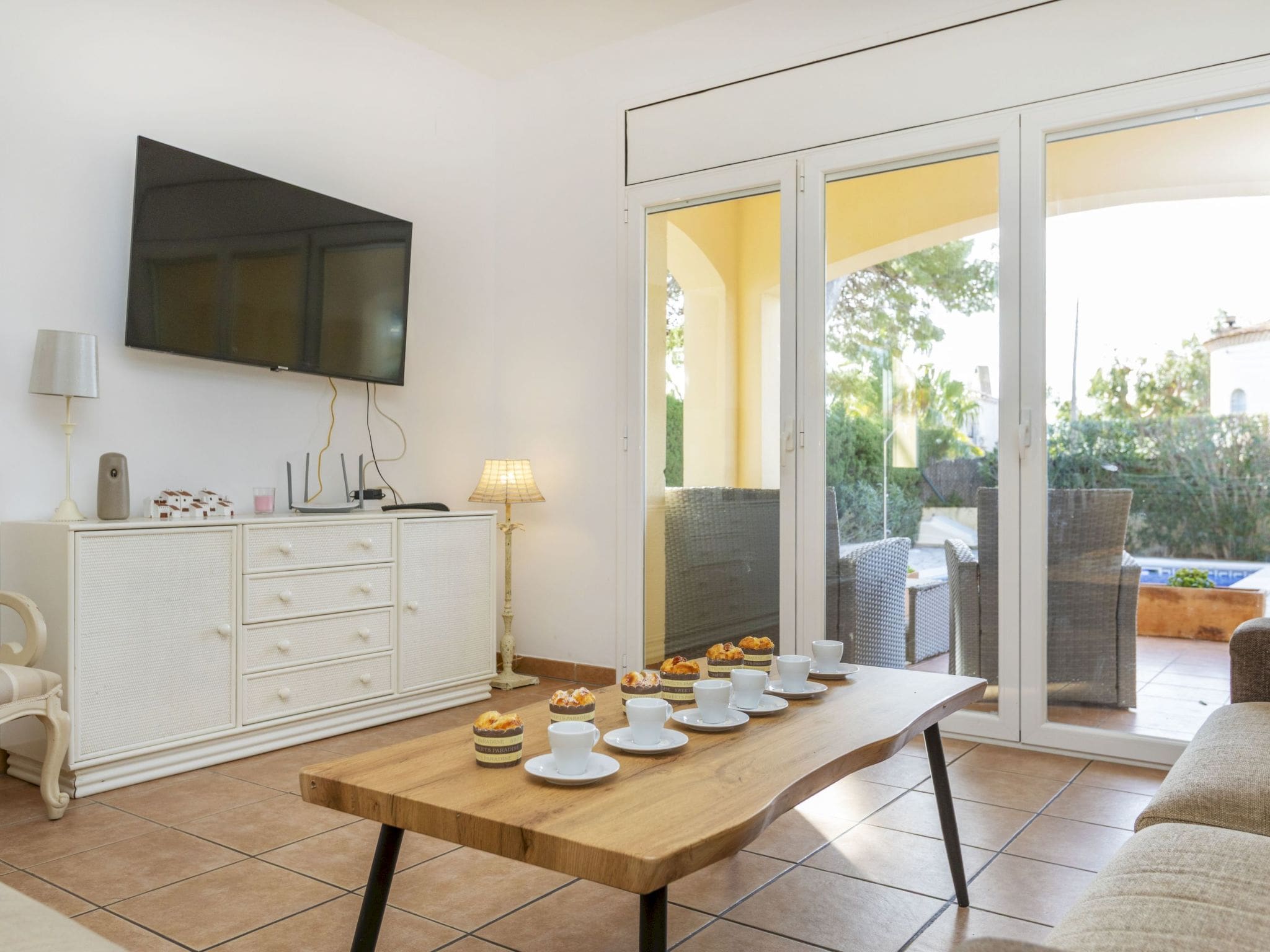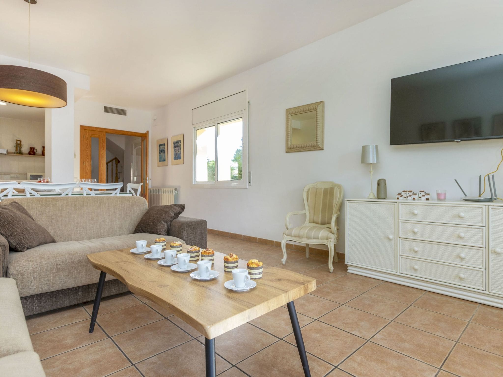 The villa’s crown jewel is undoubtedly its private angular swimming pool measuring 7×4 meters, available seasonally from May through October. Set within 520m² of beautifully landscaped and fully fenced grounds, the outdoor space provides complete privacy and security for families with children or pets. Multiple terrace areas furnished with comfortable outdoor seating and dining sets create perfect spots for al fresco meals, while the built-in barbecue facility enables memorable evening gatherings under the Spanish stars.