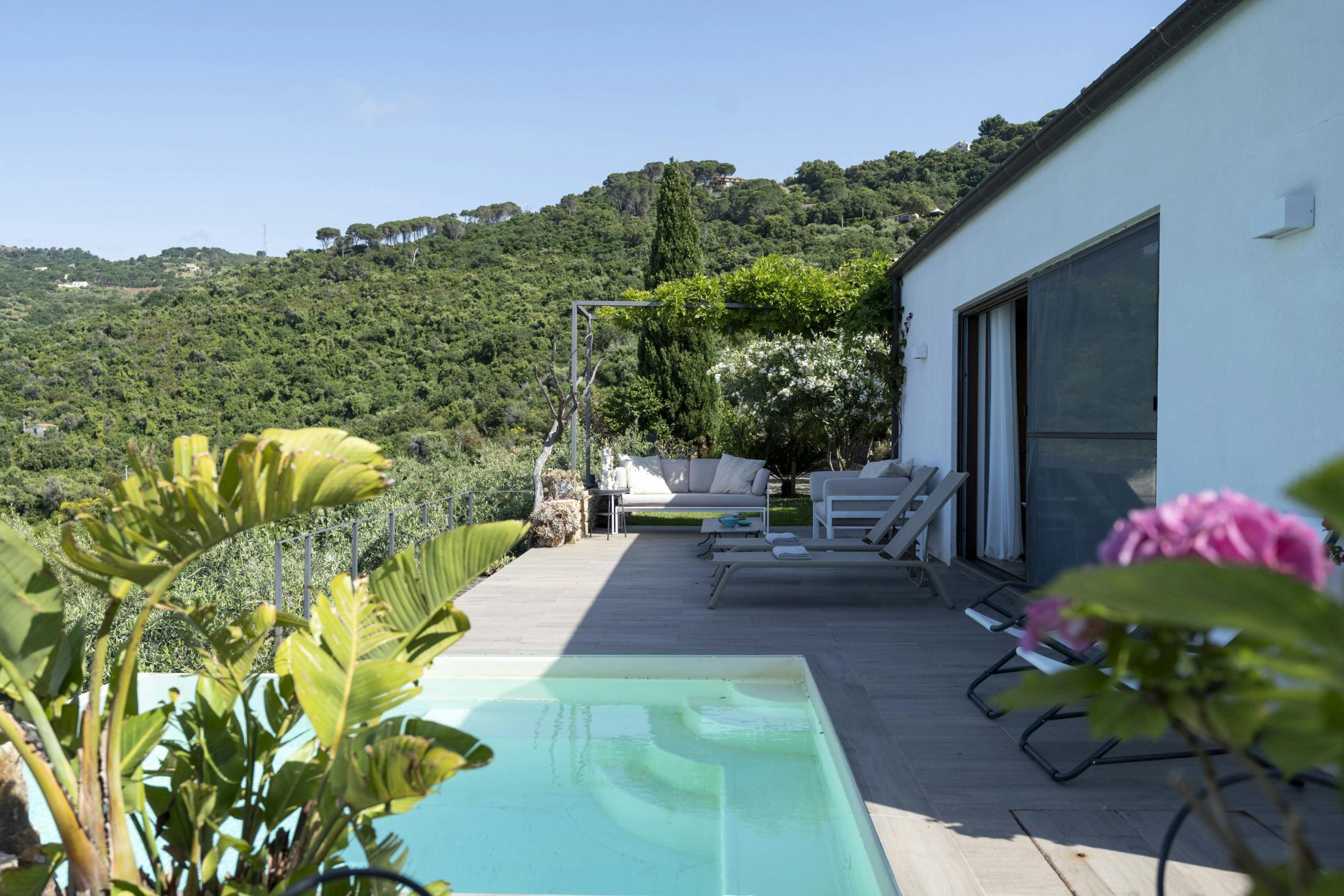 The villa’s outdoor areas are nothing short of spectacular. The swimming pool provides a refreshing escape from the Sicilian sun, while the shaded terrace offers a perfect spot for al fresco dining or simply soaking in the panoramic views of the hills and sea. The lush gardens surrounding the property add a touch of tranquility to your stay.