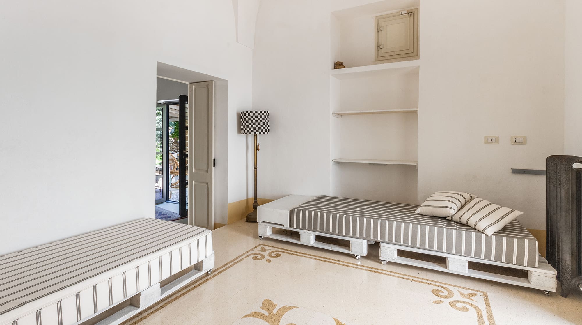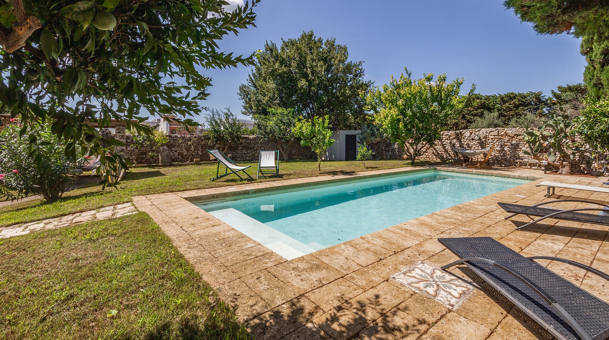 Outside, the villa’s allure continues with a stunning swimming pool set amidst lush gardens. Enjoy al fresco dining on the shaded terrace, or soak up the sun while taking in the panoramic sea views. The villa’s proximity to the beach makes it easy to explore the pristine coastline of Apulia, whether you’re swimming in the turquoise waters or taking a leisurely stroll along the shore.