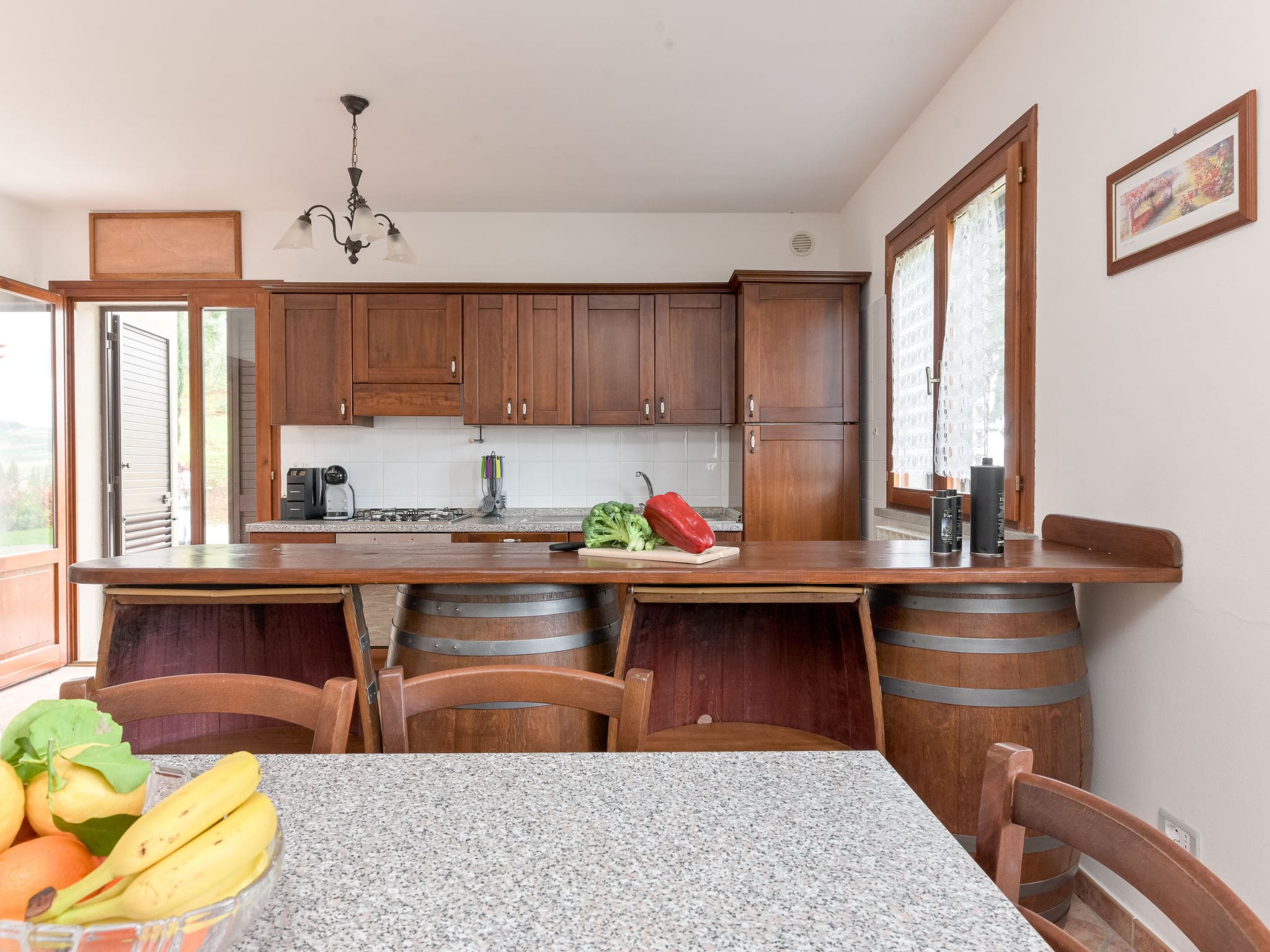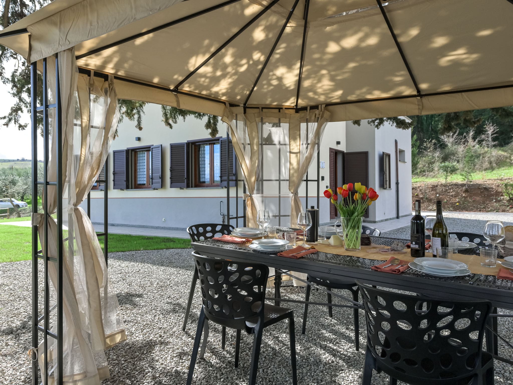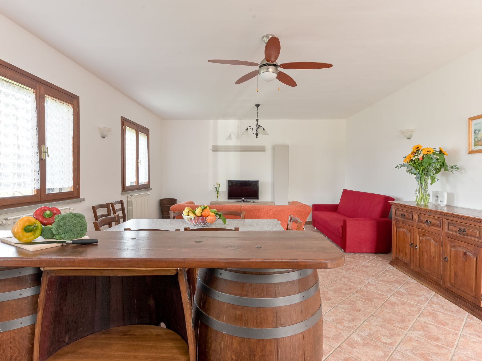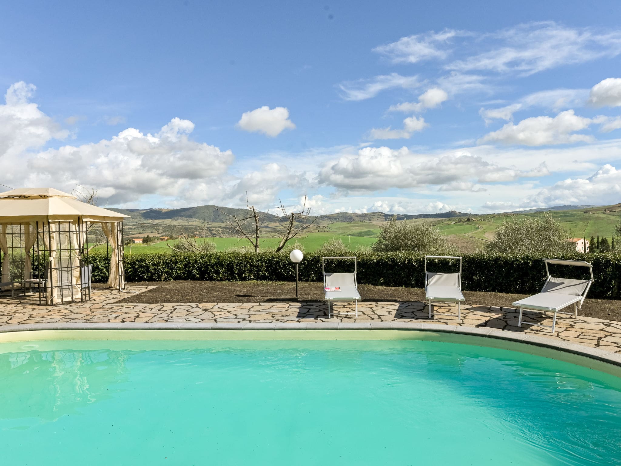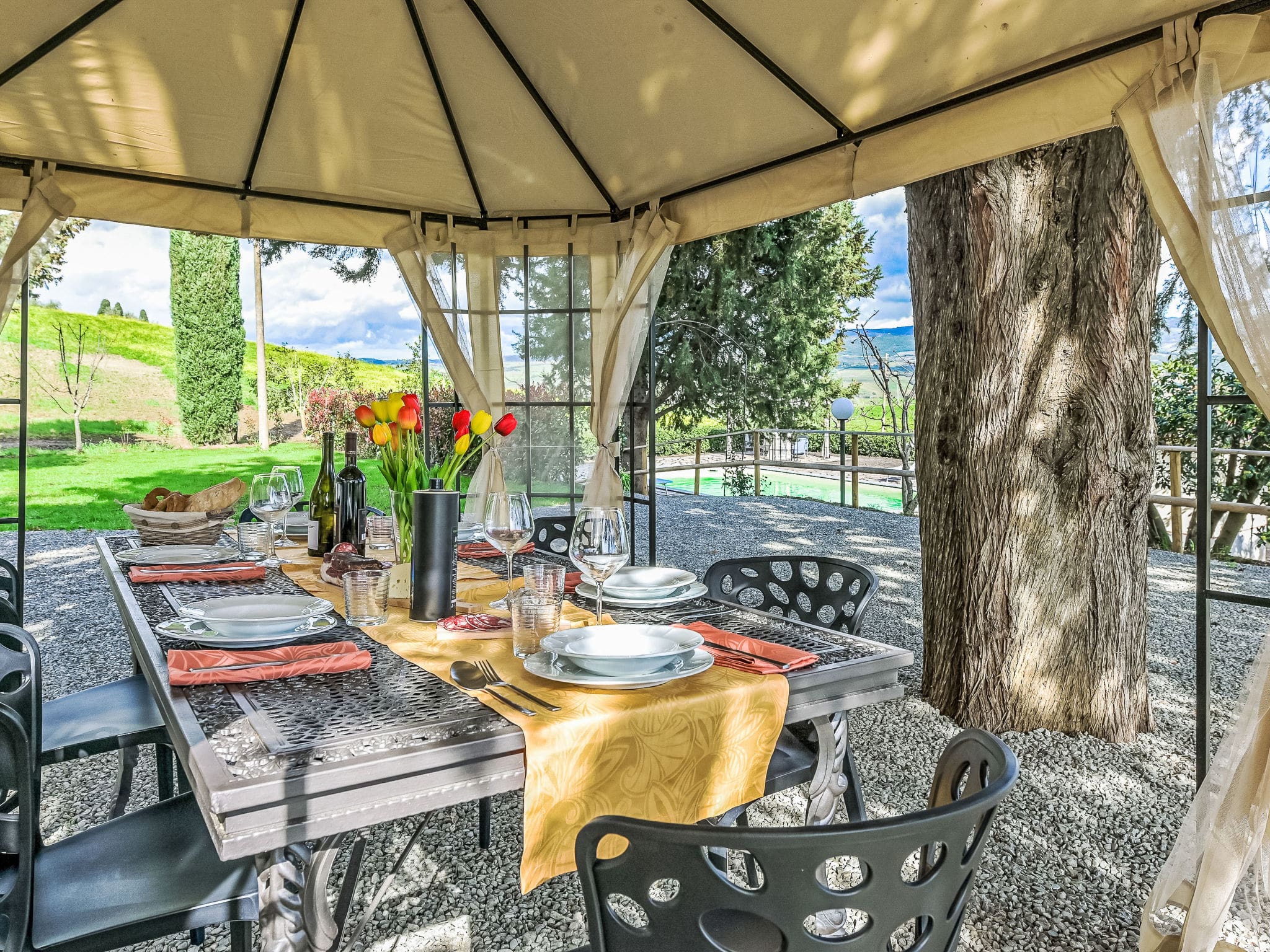 The terraced garden creates a private paradise surrounded by mature trees and wildflower meadows. The kidney-shaped swimming pool, measuring 10 by 5 metres with a depth of 124 centimetres, operates seasonally from April 15th to October 30th. An outdoor shower provides convenient pool-side refreshment, while the pergola offers shaded relaxation during warm afternoons. Garden furniture, barbecue facilities, and deck chairs are perfectly positioned to take advantage of the stunning countryside vistas. The porch and multiple terraced areas create intimate spaces for morning coffee or evening aperitivos, while private parking ensures complete convenience.