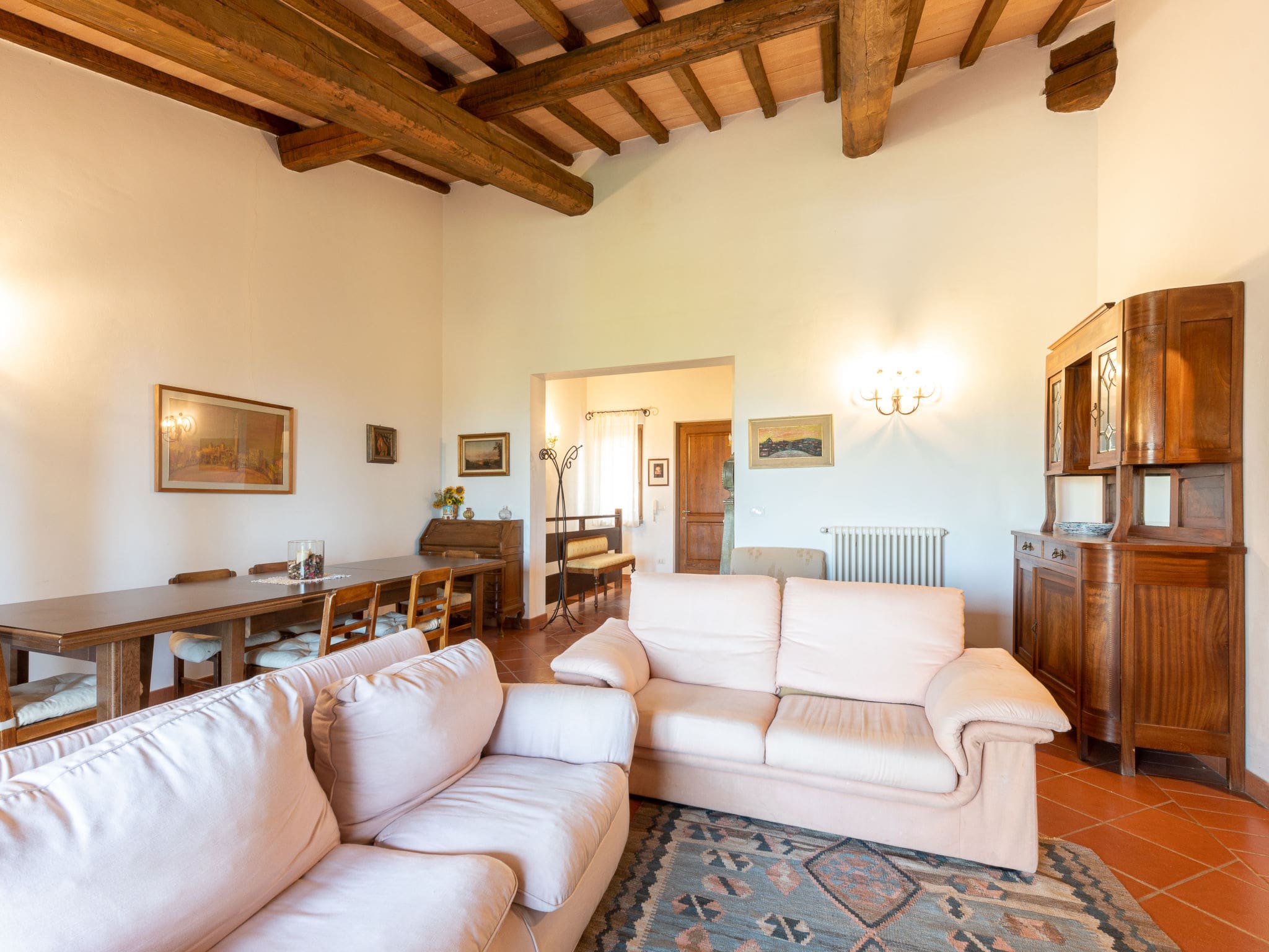 Spread across two levels and 240 square metres, this beautifully appointed villa combines rustic Tuscan charm with modern comfort. The ground floor welcomes guests with a spacious living and dining area featuring an open-hearth fireplace, flat-screen television, and direct access to the garden and pool terrace. Three bedrooms are located on this level, including a master with en-suite shower room, plus a well-equipped kitchen with dishwasher, gas hob, microwave, and coffee machine. The upper floor houses a second living area with fireplace and kitchenette, three additional bedrooms with fans, and luxurious bathroom facilities including a hydromassage bath. Thoughtful touches include WiFi throughout, washing machine, and mosquito nets for comfortable summer evenings.