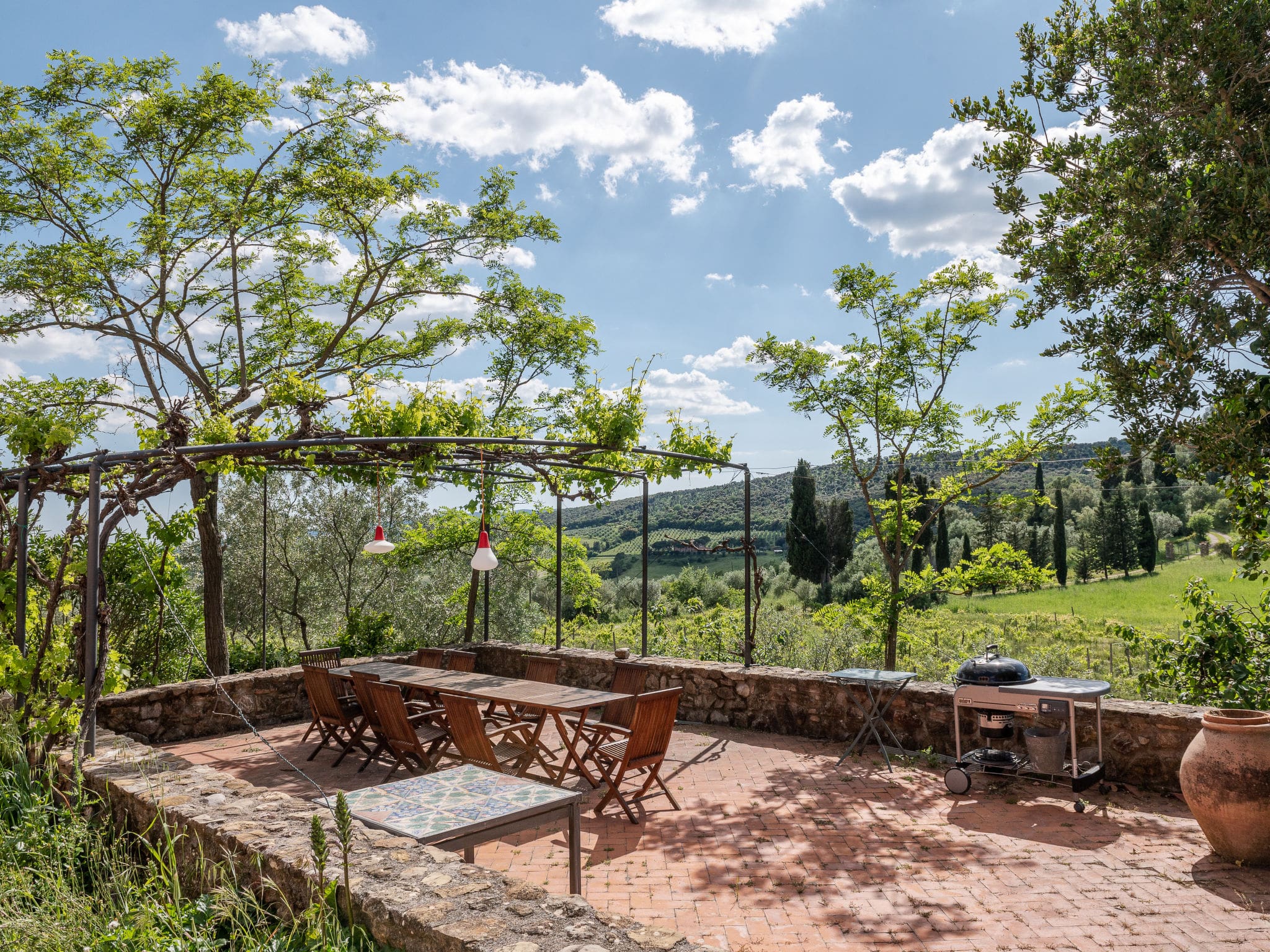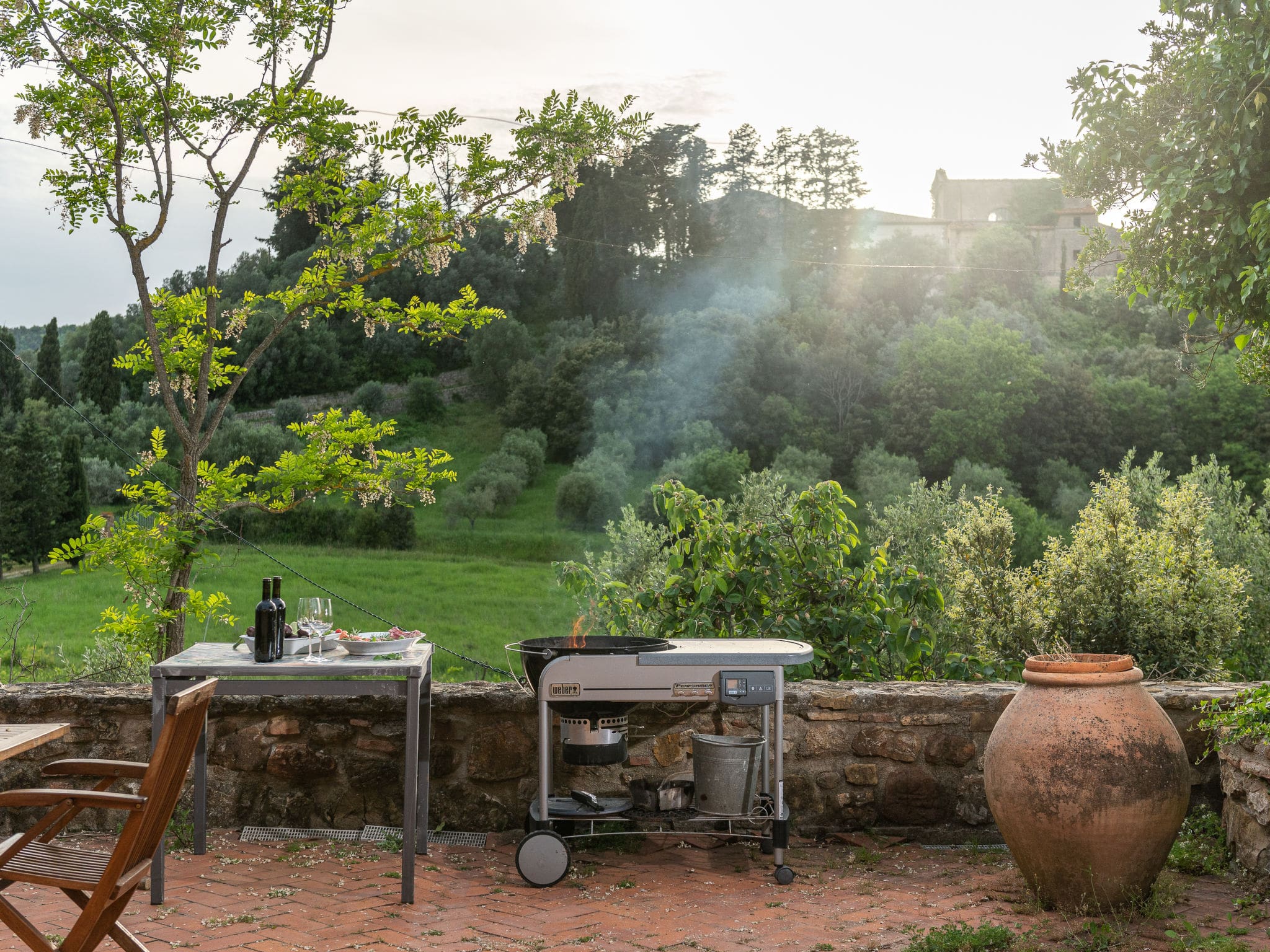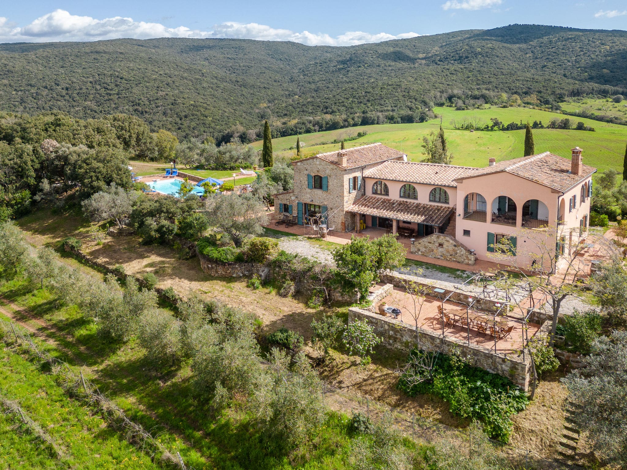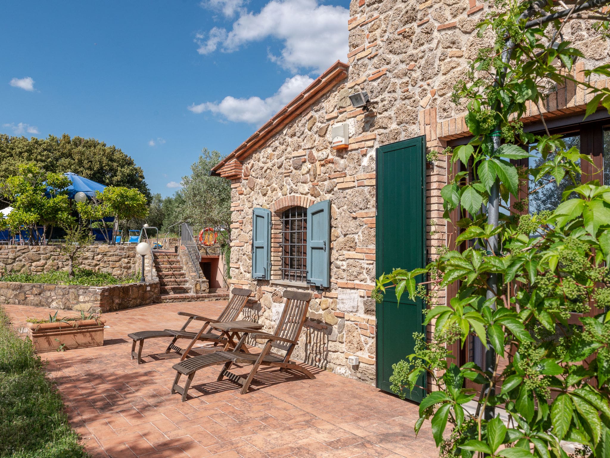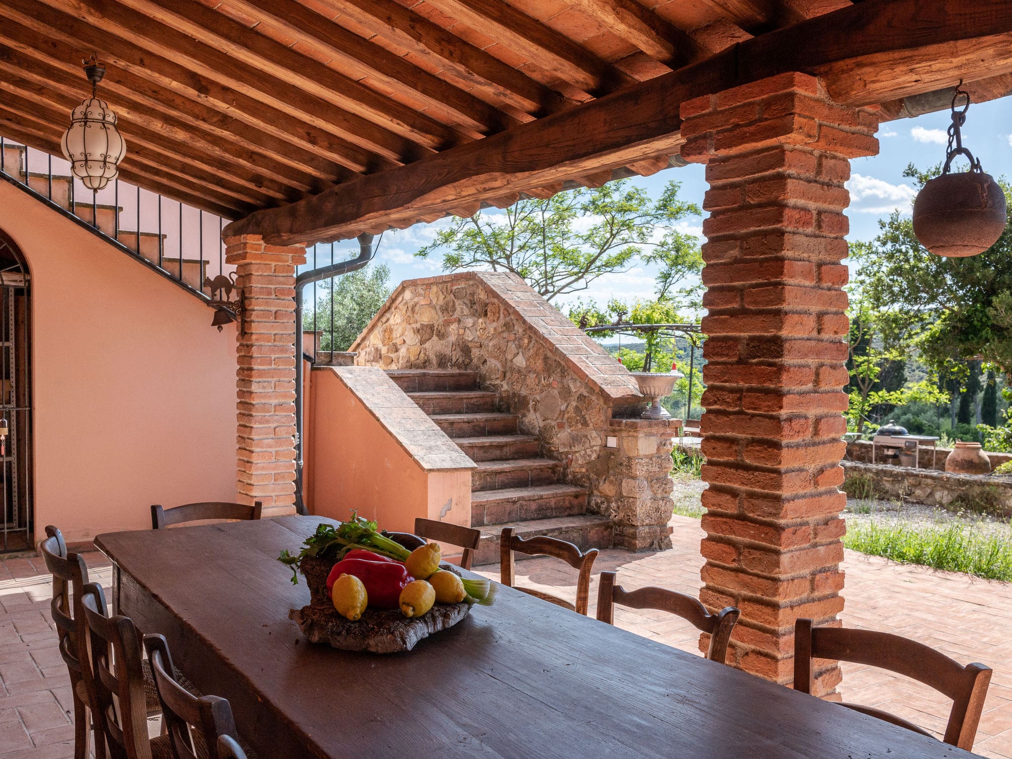 A large dining terrace equipped with barbecue facilities overlooks the historic episcopal summer residence on the opposite hill, guaranteeing spectacular sunsets each evening. A covered terrace provides shaded space perfect for leisurely breakfasts or afternoon siestas. The beautiful garden, surrounded by vineyards and fields, offers complete tranquility with the Natural Park Riserva Statale Marsiliana bordering the property.