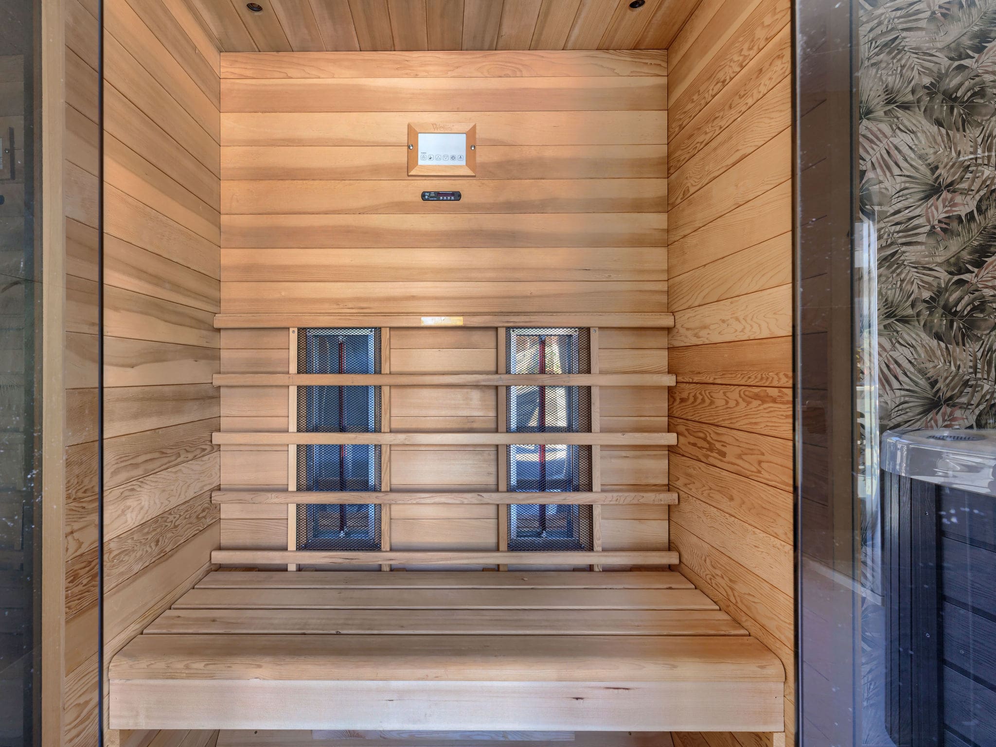 Premium amenities include air conditioning throughout, underfloor heating, complimentary WiFi, a private sauna, and an indulgent hot tub. The villa’s modern design incorporates sustainable features including solar panels, water-efficient fixtures, and LED lighting systems.
