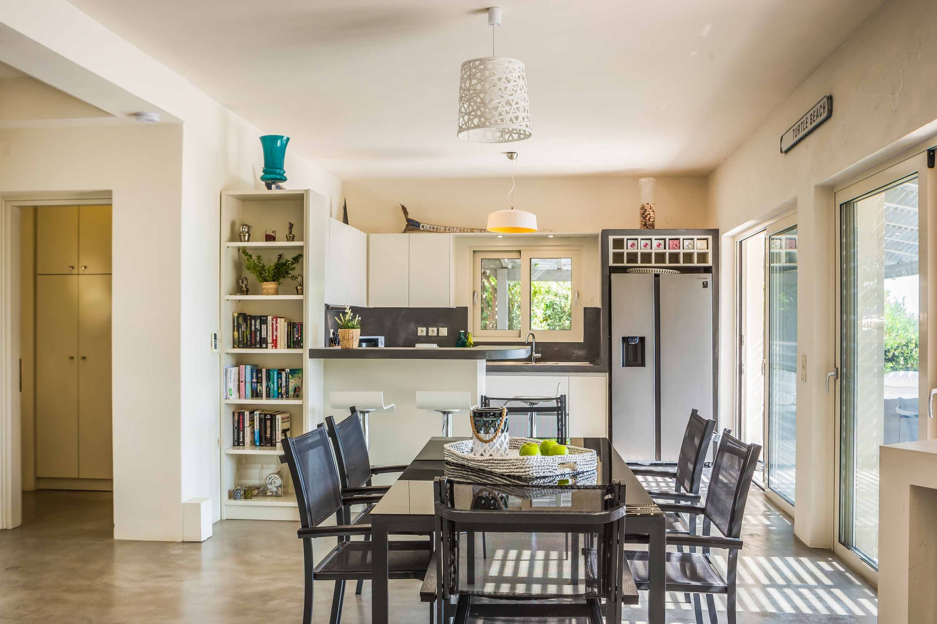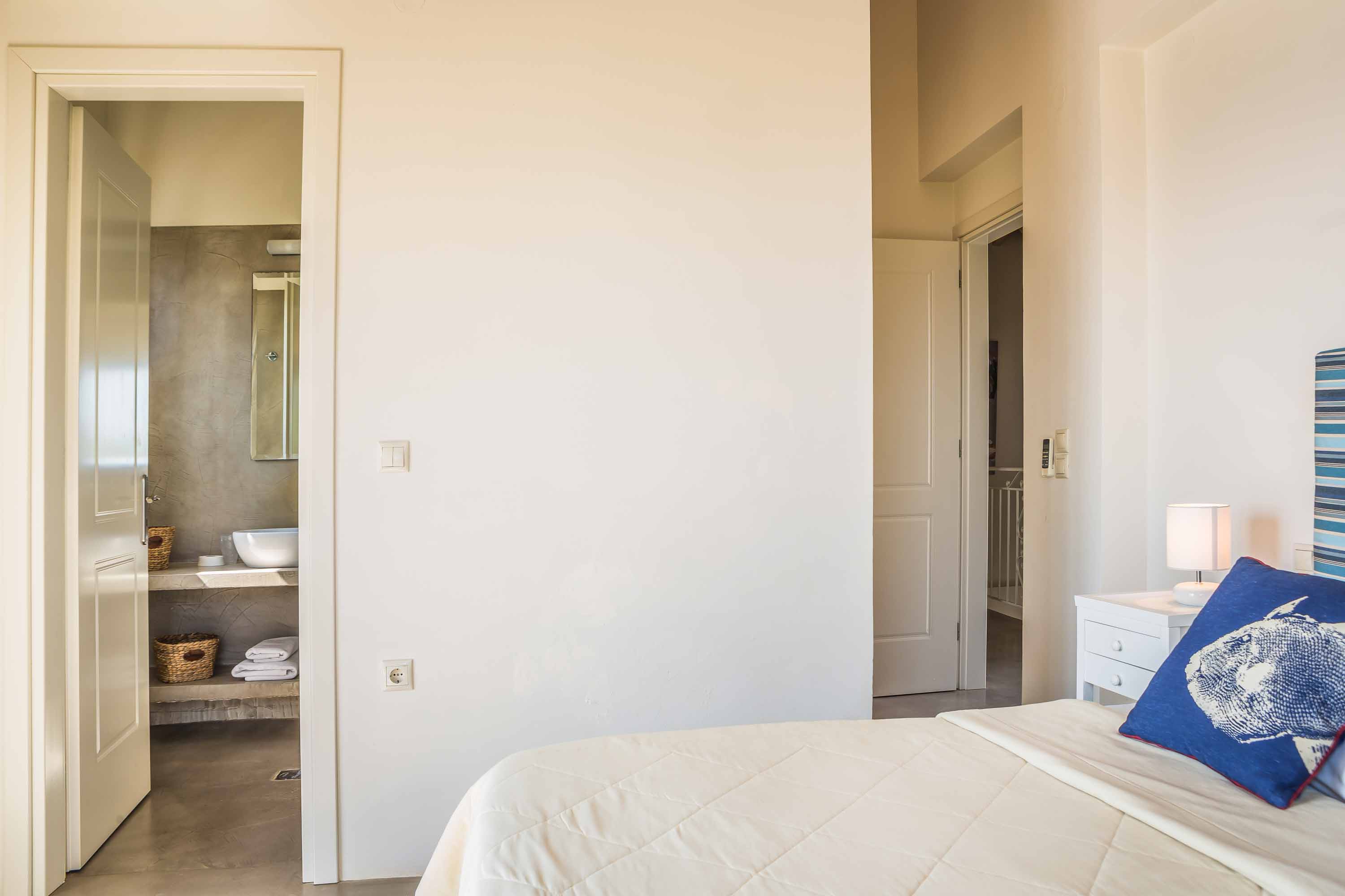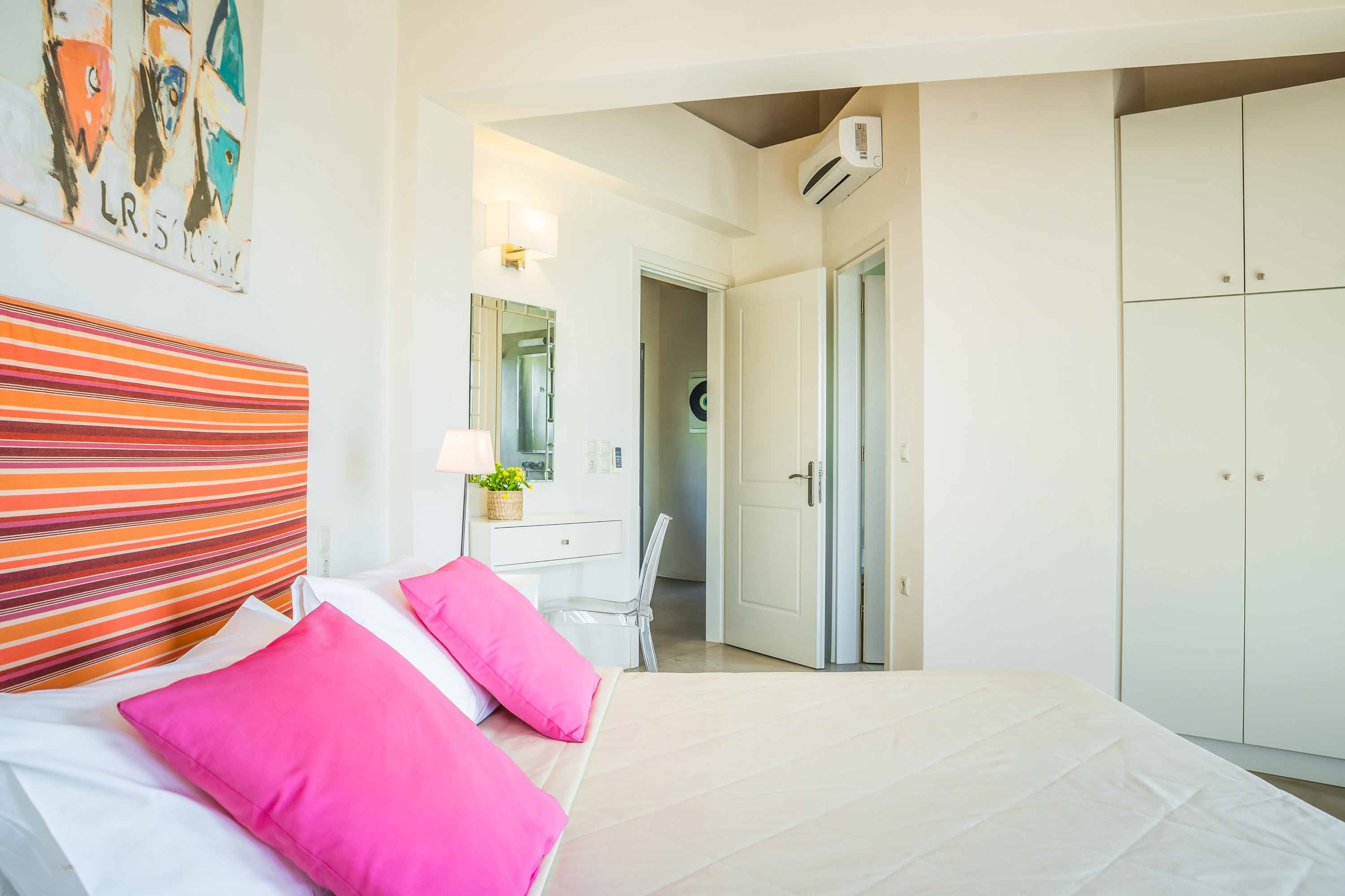 The apartment comfortably accommodates up to eight guests with its four bedrooms and bathrooms. While the property is spread over two floors with stairs leading to the entrance, it offers free parking for those who choose to rent a car. Please note that cots and high chairs must be requested at the time of booking. Explore more luxury villa rentals in Greece.