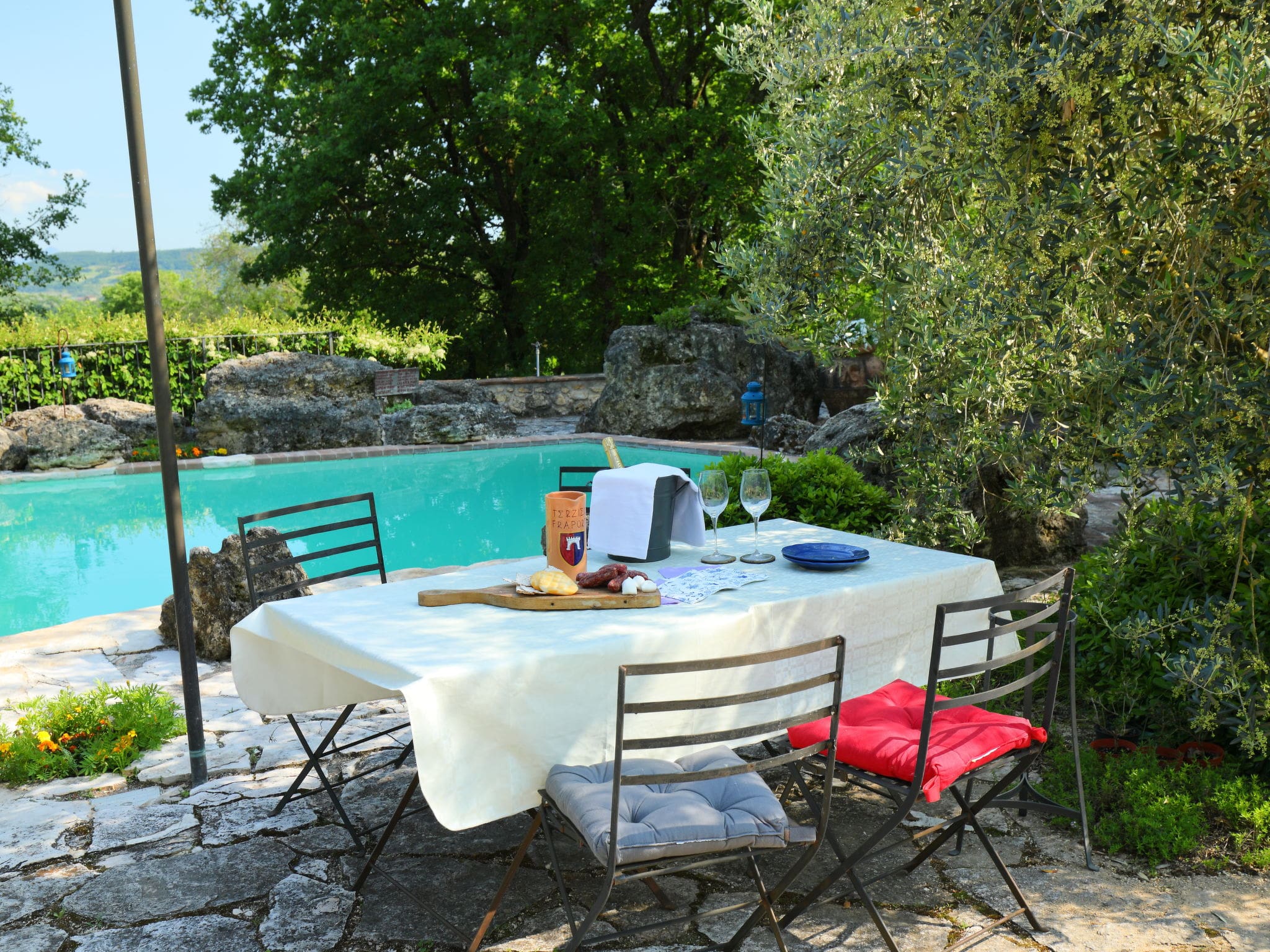 The extensive grounds feature wildlife gardens, walking paths, and a barbecue area for outdoor cooking. An outdoor shower provides convenient poolside refreshment, while comfortable lounging areas with deck chairs invite guests to soak up the peaceful countryside atmosphere. The property’s elevated position at 325 metres above sea level ensures cooling breezes and spectacular views across the Umbrian landscape.