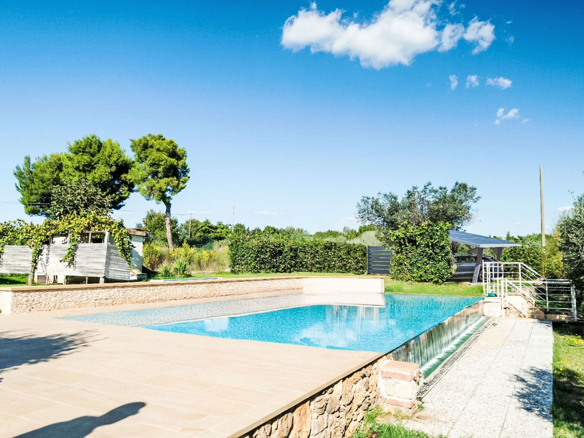 An outdoor shower allows guests to rinse off after swimming, while the barbecue area and expansive patio create perfect settings for al fresco dining. Deck chairs positioned around the pool invite lazy afternoons under the Tuscan sun, while terrace and balcony furniture provide multiple outdoor relaxation zones. The property includes covered parking for three vehicles, ensuring convenient arrival and secure storage.