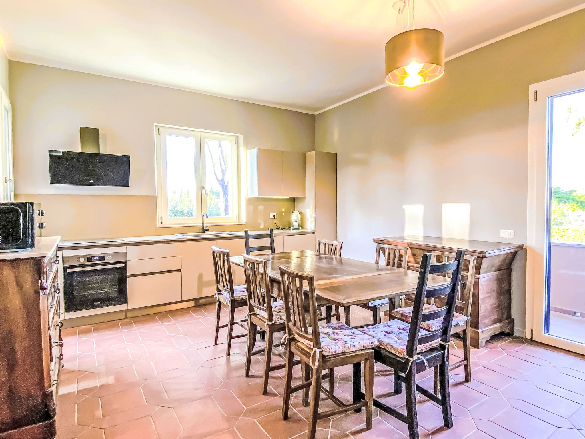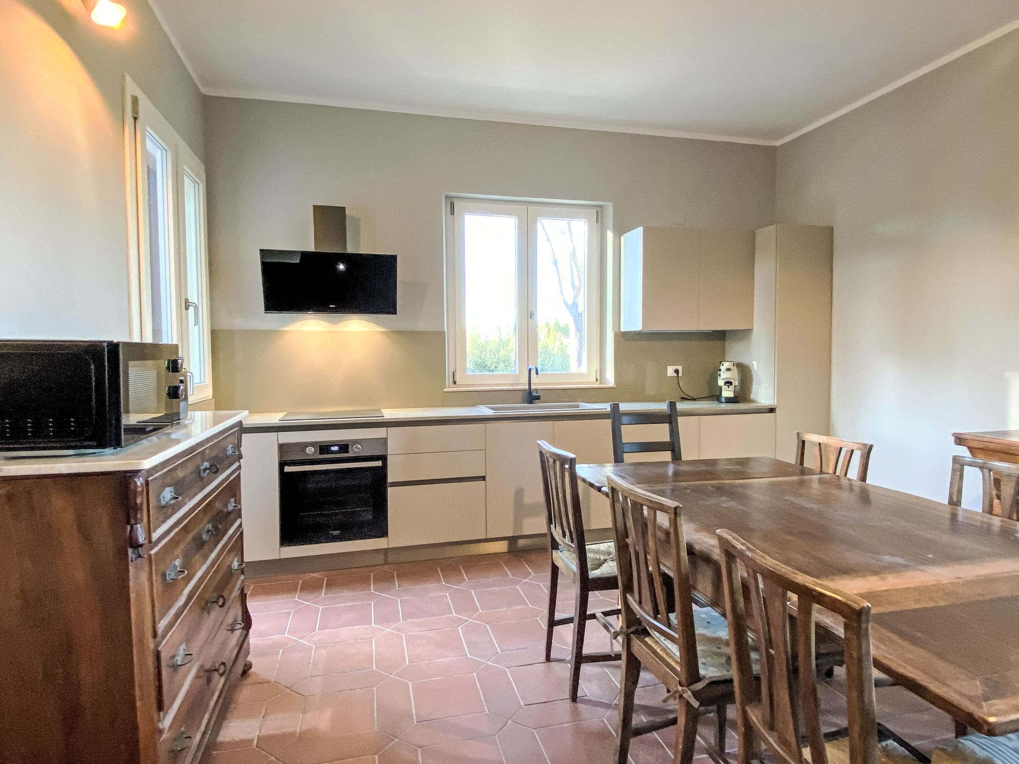 The open-plan kitchen serves as the heart of the home, equipped with modern induction hobs, oven, dishwasher and everything needed for preparing memorable meals. A dining area flows naturally from the kitchen, while glass doors open onto the balcony, creating an effortless indoor-outdoor lifestyle. Air conditioning throughout ensures comfort during warm Tuscan summers, while solar power reflects a commitment to sustainable luxury.