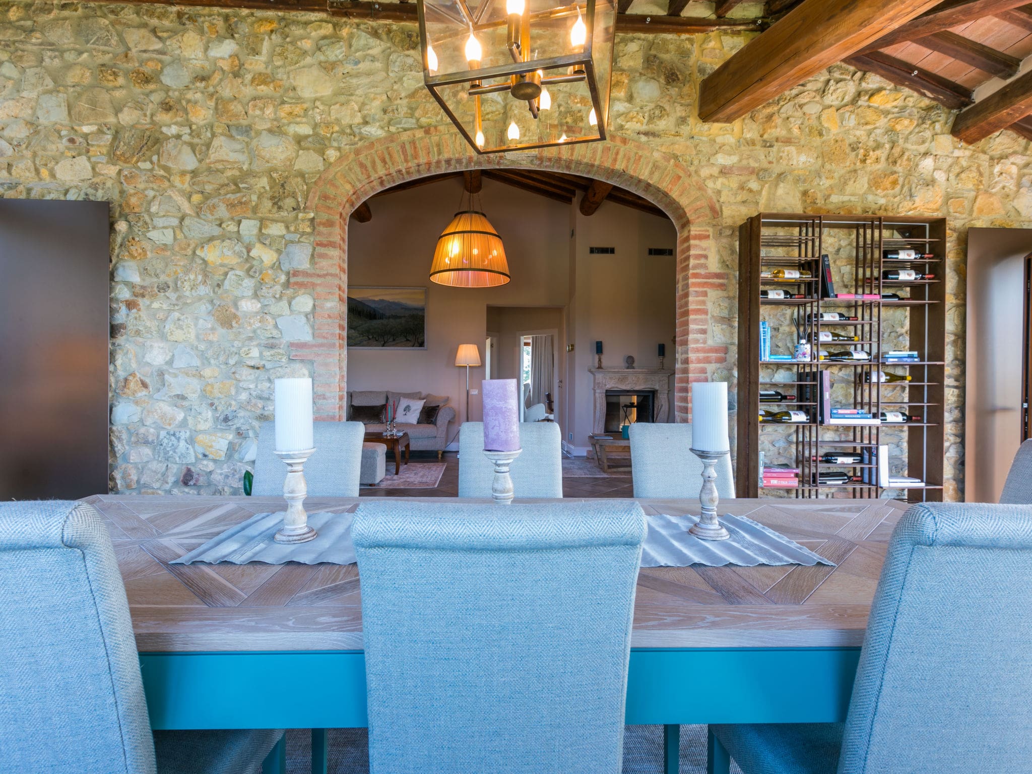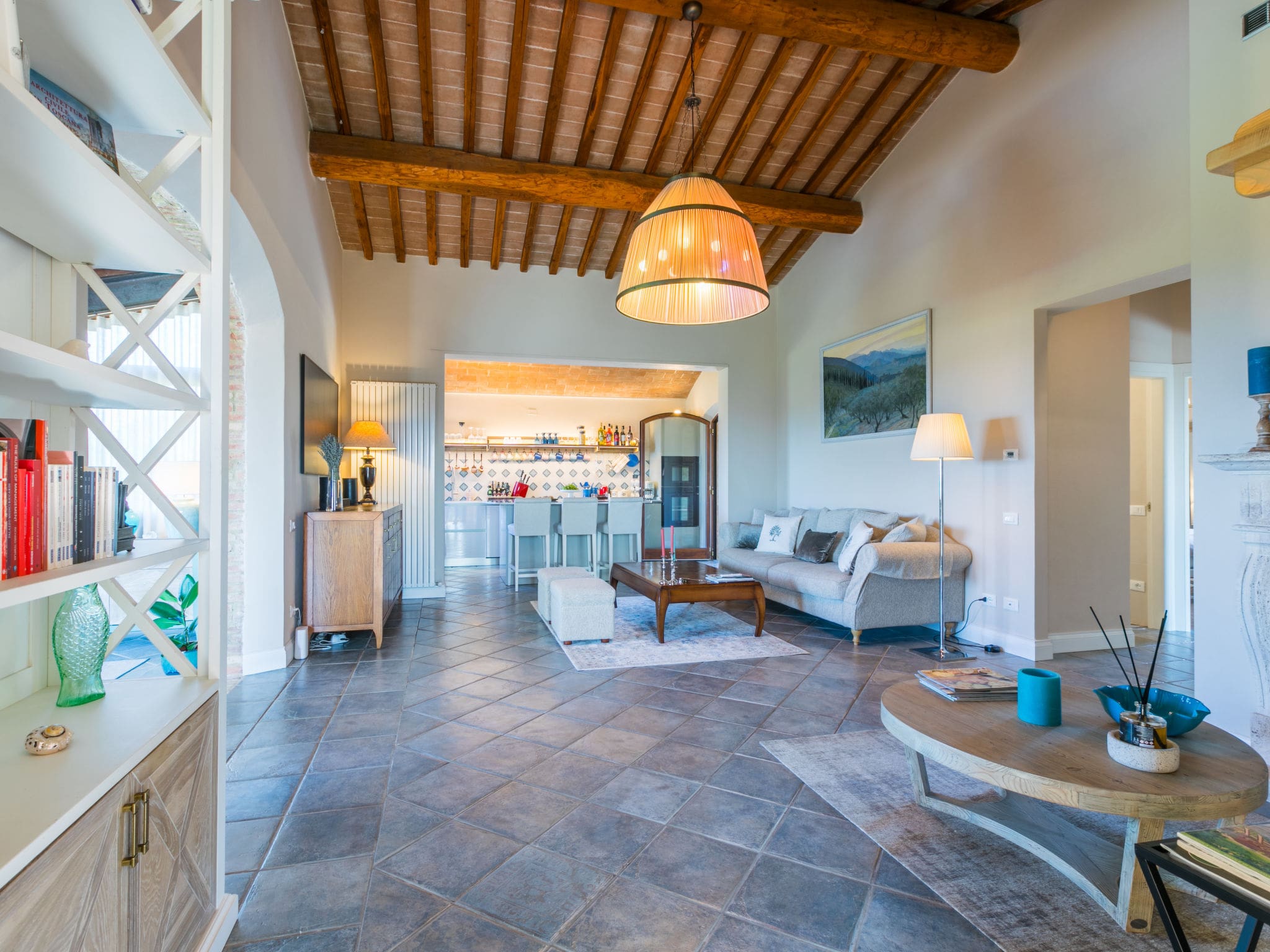 The open-plan kitchen delights culinary enthusiasts with modern appliances including an oven, dishwasher, four induction hobs, and an electric coffee machine. A convenient breakfast bar provides casual dining space, while the fully equipped kitchen ensures effortless meal preparation. Air conditioning throughout the villa guarantees comfort during warm Tuscan summers, and complimentary WiFi keeps you connected when desired.