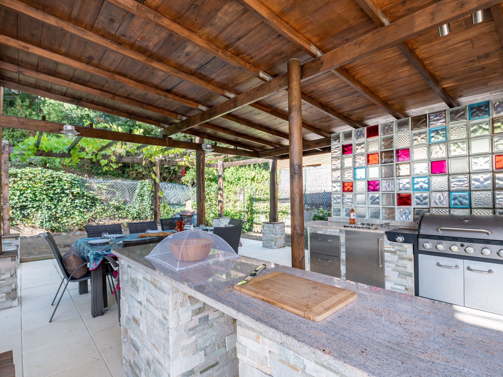 The expansive 80-square-metre covered terrace serves as an outdoor living room, furnished with comfortable seating for eight and equipped with barbecue facilities for memorable al fresco dining. Seven deck chairs are strategically positioned to capture both morning sunshine and afternoon shade, while the mature gardens provide natural privacy and tranquil Mediterranean ambiance.