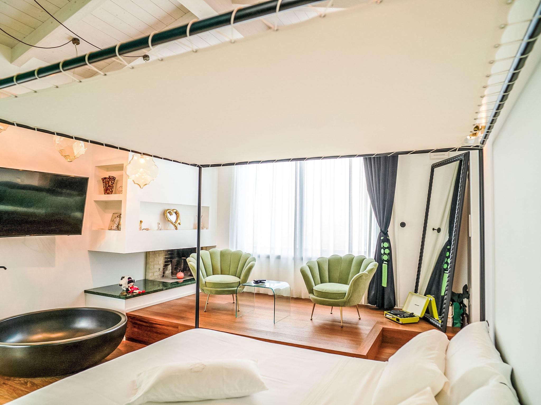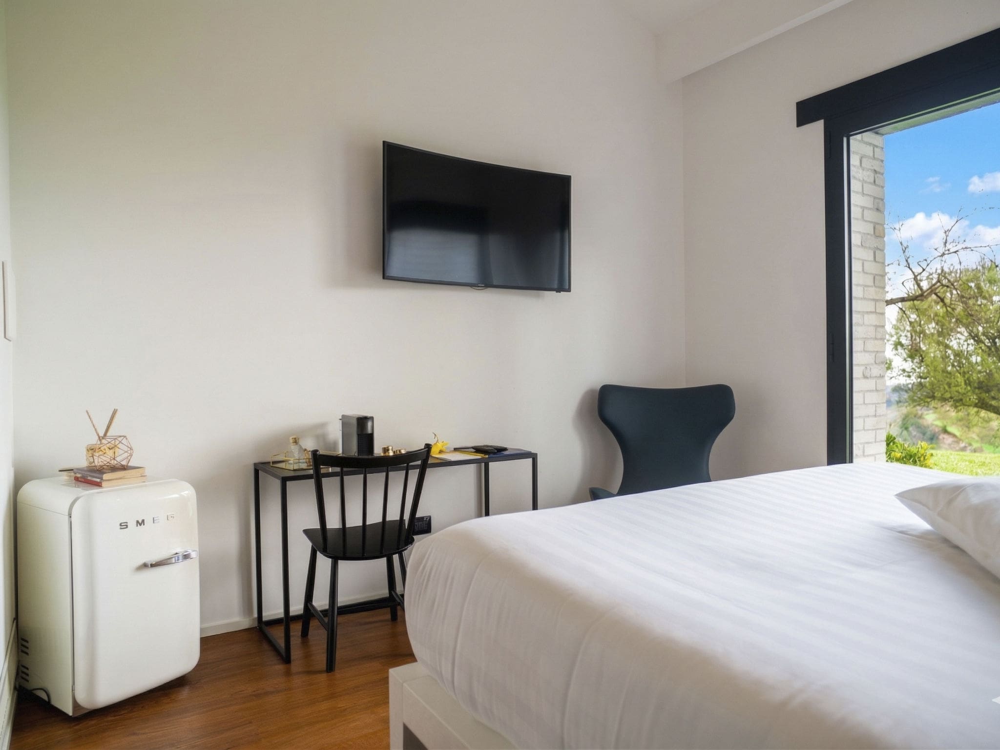 The villa’s modern architectural design creates a seamless flow between indoor and outdoor living spaces. The ground floor features an expansive living and dining area anchored by a dramatic open-hearth fireplace and floor-to-ceiling panoramic windows that frame the surrounding vineyards and meadows. Three elegantly appointed bedrooms on this level each feature double beds, private televisions, and direct garden access, while the state-of-the-art kitchen impresses with its five induction hotplates, cooking island, and premium appliances including an electric coffee machine. The upper floor houses two luxurious master suites, each featuring panoramic windows, corner bathtubs, open-hearth fireplaces, and private terrace access with sweeping valley views. Throughout the villa, air conditioning and modern amenities ensure year-round comfort.