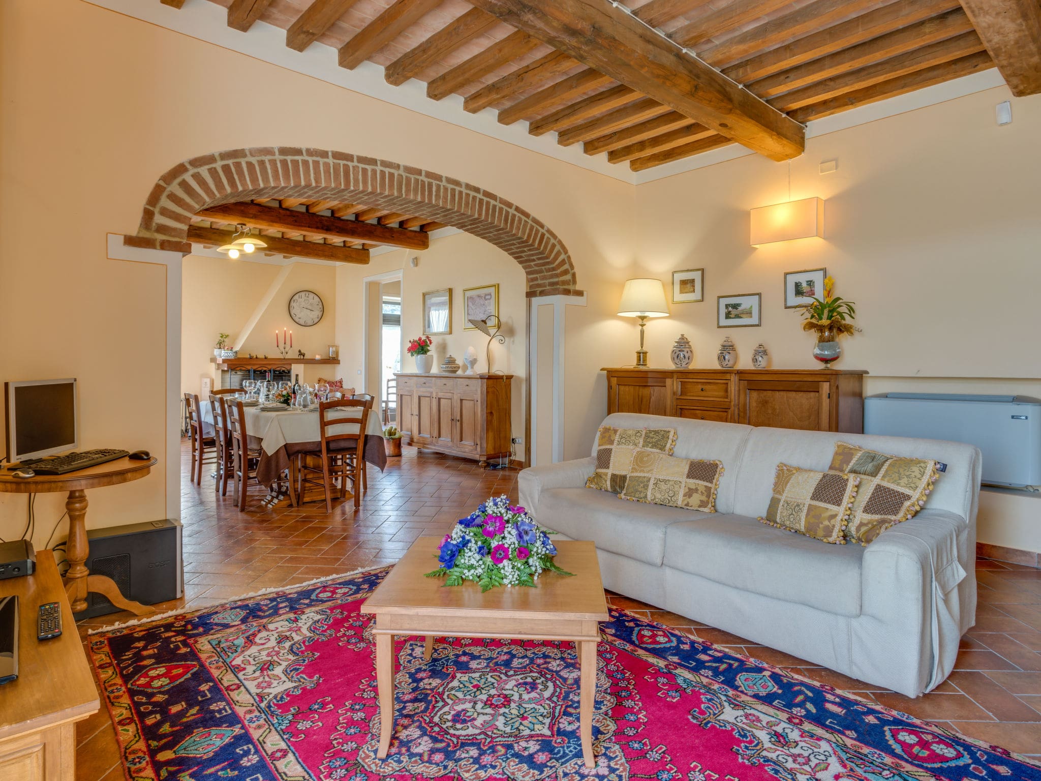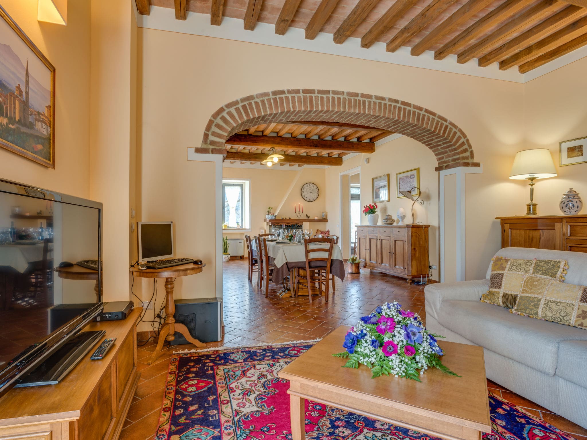 The upper floors house five additional double bedrooms, each thoughtfully designed with traditional Tuscan elements and modern comforts including complimentary WiFi access. The property’s crown jewel lies in its panoramic views across the Val di Chiana, where centuries-old olive groves stretch toward the medieval towers of nearby Cortona.