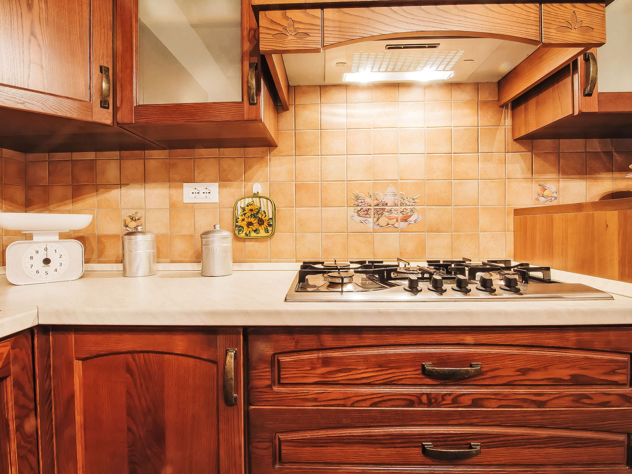 The fully equipped kitchen showcases Italian hospitality with its gas stove featuring five burners, oven, microwave, freezer, and electric coffee machine. Direct access to the patio from the kitchen creates seamless indoor-outdoor living, perfect for preparing meals using fresh local ingredients from nearby markets. Modern conveniences include complimentary WiFi throughout, washing machine, and tumble dryer, ensuring comfortable extended stays.