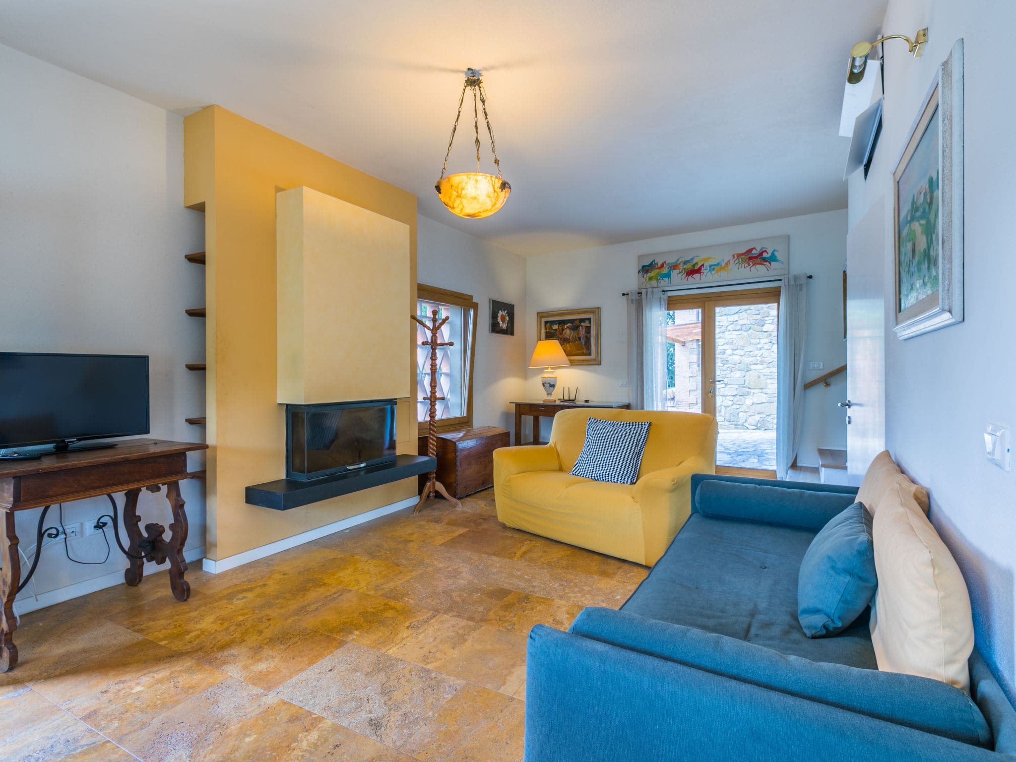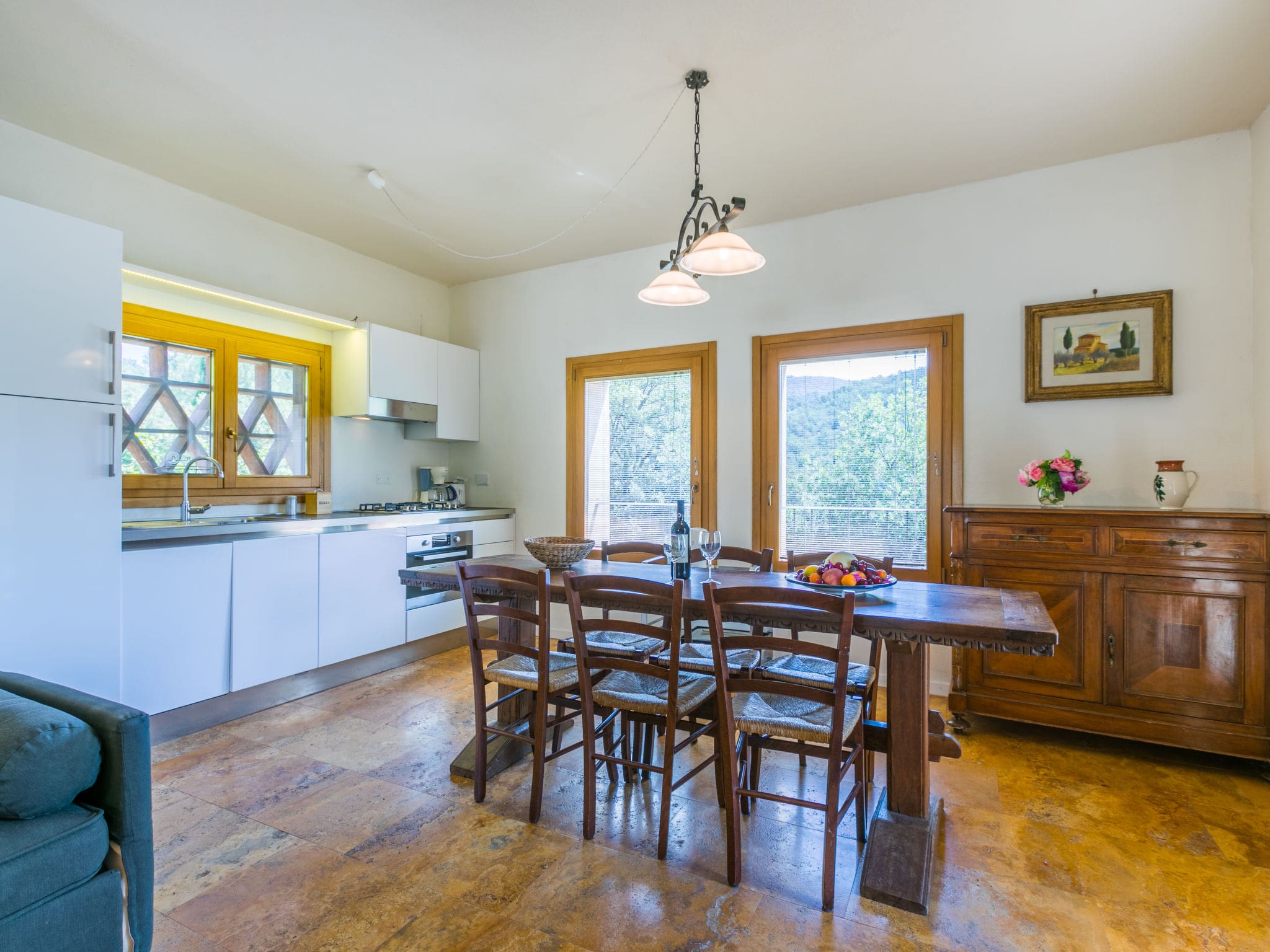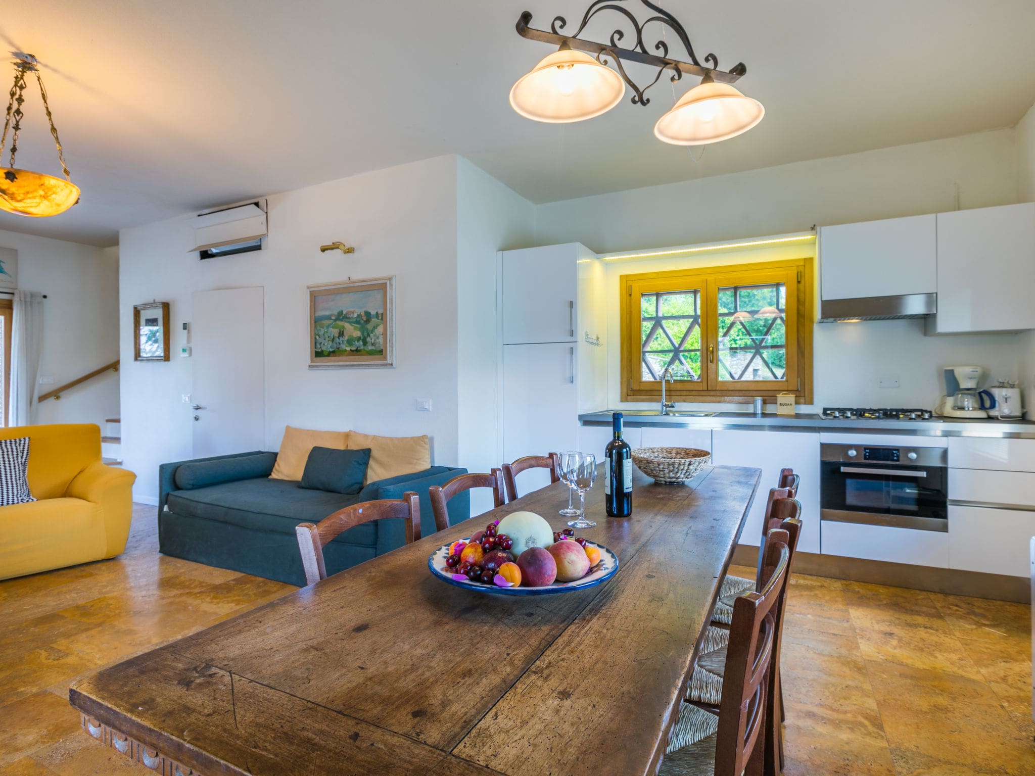 The ground floor welcomes guests with a spacious living and dining room featuring satellite television, a wood-burning stove, and direct garden access. Two double bedrooms on this level each offer en-suite bathrooms with shower, bidet, and WC facilities. The well-equipped kitchen showcases five gas burners, a dishwasher, oven, microwave, and electric coffee machine, perfect for preparing meals with local ingredients from nearby markets.