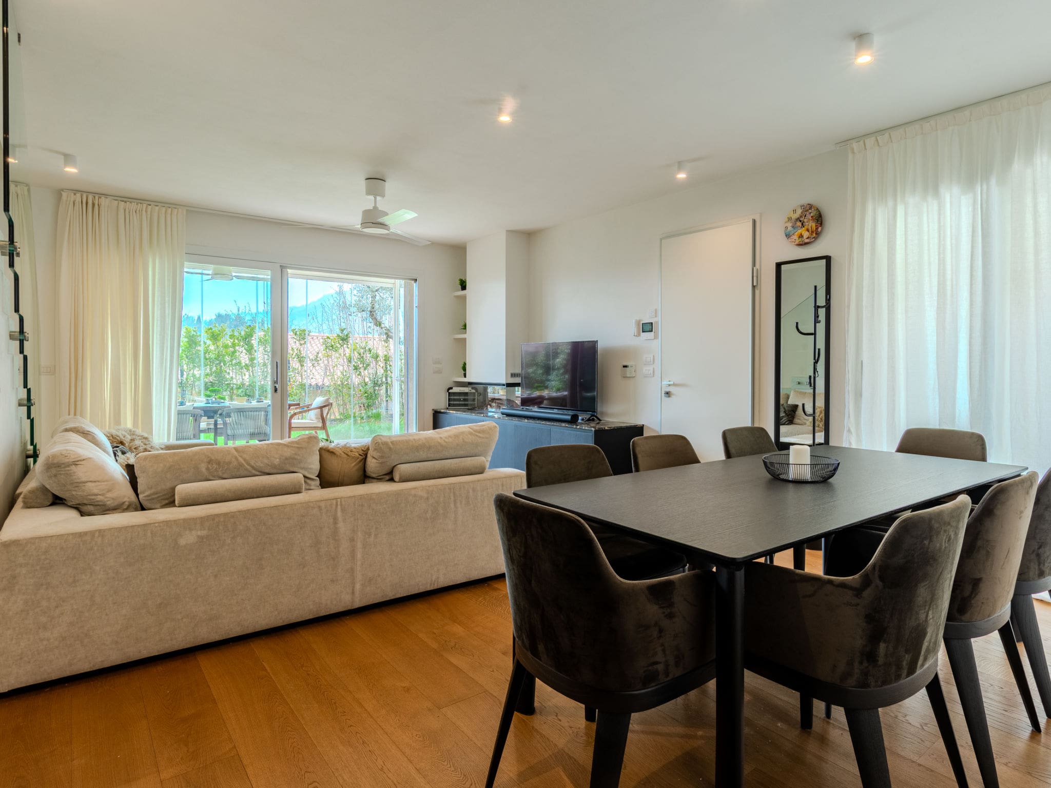 The villa’s outdoor spaces truly set it apart, featuring a beautifully maintained private garden perfect for relaxation and al fresco dining. The centerpiece is an 8×3 metre heated swimming pool, available year-round with a protective cover system. Multiple terraces and a large patio provide various spots to enjoy the Italian sunshine, while outdoor furniture, deck chairs, and a barbecue area create perfect settings for entertaining guests or enjoying quiet family moments.