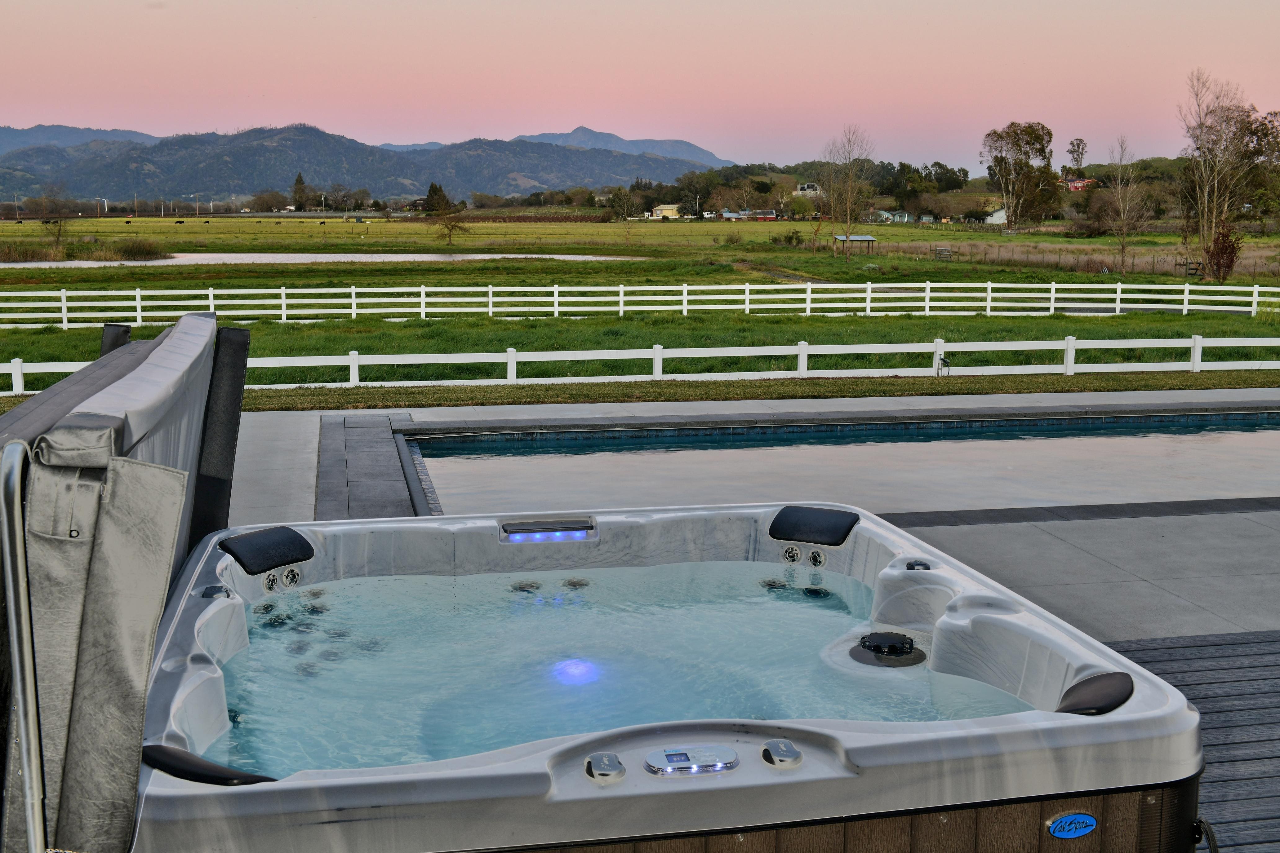 The outdoor amenities are equally impressive, featuring a heated swimming pool and a hot tub, ideal for relaxing under the Californian sun. Lush gardens surround the property, creating serene spots for outdoor dining or simply soaking in the peaceful ambiance of Sonoma Valley. An unfenced pond adds to the charm, making it an enchanting site for birdwatching; however, it is advised that children be supervised when exploring these areas.