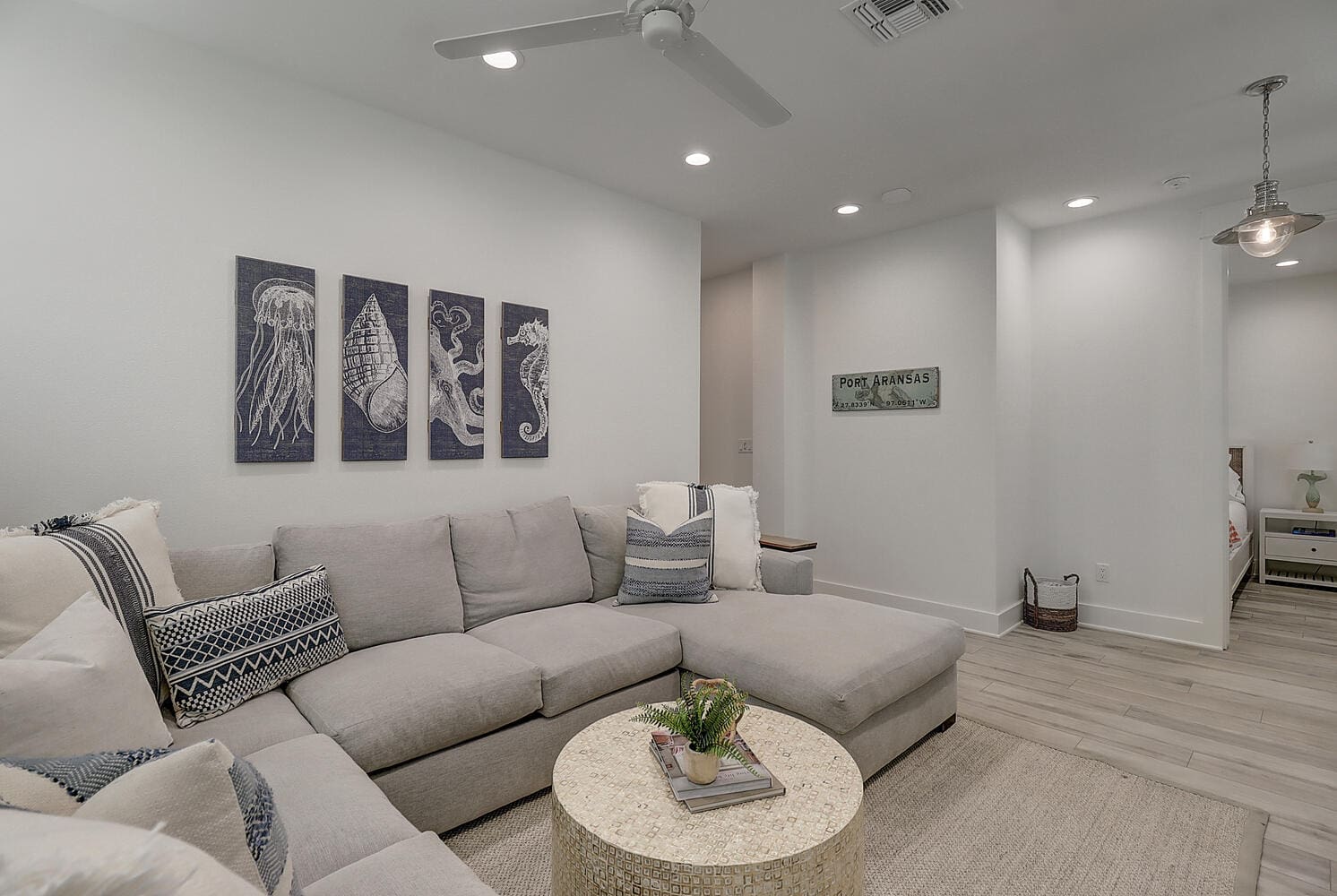The outdoor areas of Vista Mar Azul are nothing short of spectacular. A private swimming pool offers a refreshing escape on warm Texas days, while spacious terraces provide perfect spots for sunbathing or enjoying al fresco dining with stunning views. Lush gardens surrounding the villa add a touch of tranquility, making it an idyllic setting for relaxation and family fun.