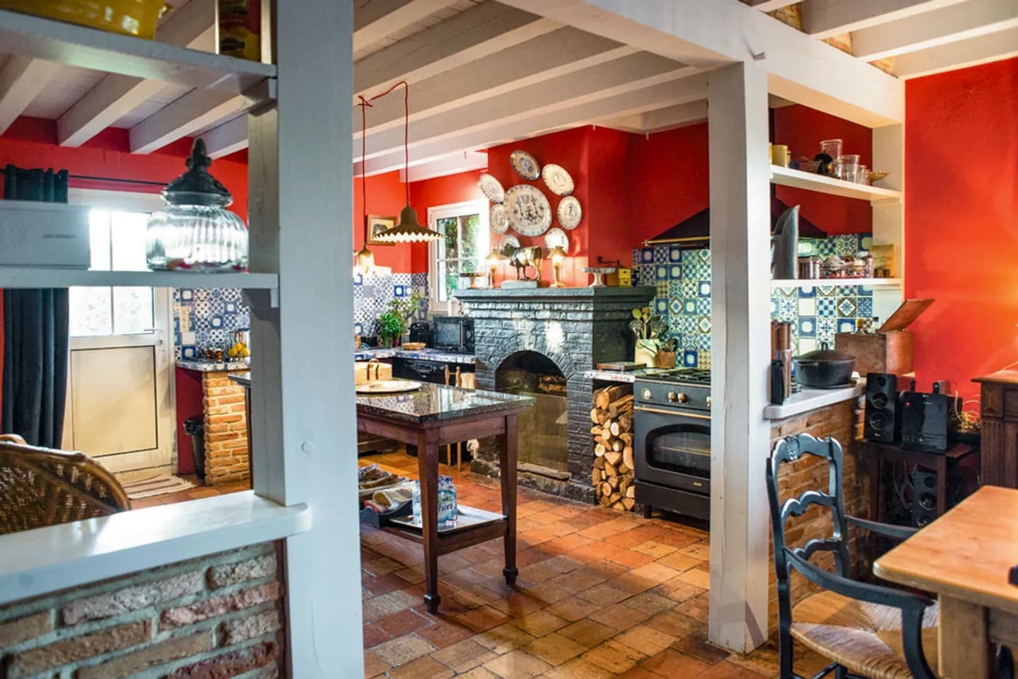 Inside, the villa features bright open-plan living spaces designed for comfort and refined simplicity. Soft sofas and a working fireplace create a cosy setting for cooler evenings, while the adjoining living areas ensure easy flow throughout the home. Thoughtful interior details, colourful touches, and characterful accents give each room its own charming personality. It is an inviting space where families and friends can gather, relax, and enjoy slow mornings or serene evenings.