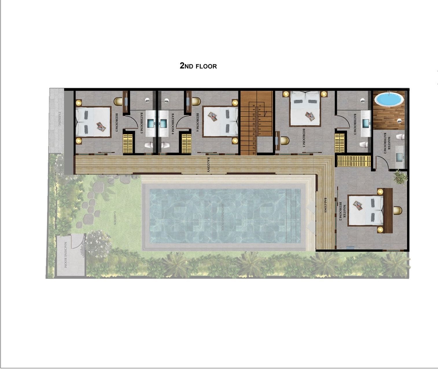 Ascend to the first floor, where you will discover the magnificent master bedroom. This spacious retreat features a king-size bed, a private terrace with stunning views, and a lavish en-suite bathroom equipped with both a sumptuous bathtub and a deluxe walk-in shower. Additionally, you will find three well-appointed bedrooms, each boasting king-size beds, access to private balconies, and en-suite shower rooms, ensuring comfort and privacy for every guest.