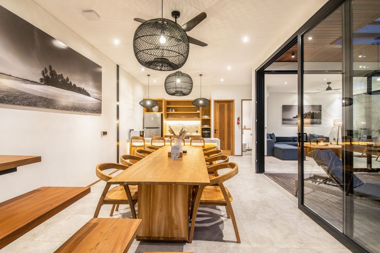 Upon entering, you are greeted by an expansive living room featuring plush seating arrangements, designed for relaxation and entertainment. Step through the large glass doors onto the serene terrace, where breathtaking views await. The opulent open-plan dining area comfortably accommodates up to 10 guests, making it ideal for hosting unforgettable dinners, while also providing access to the terrace for al fresco dining under the stars.
