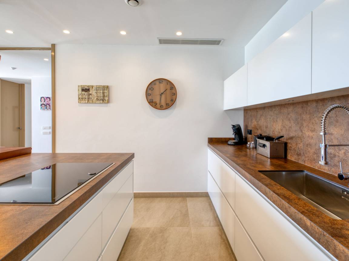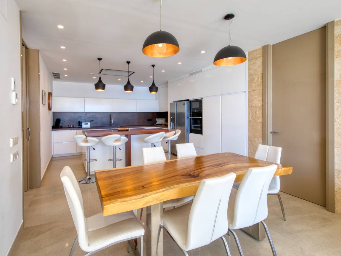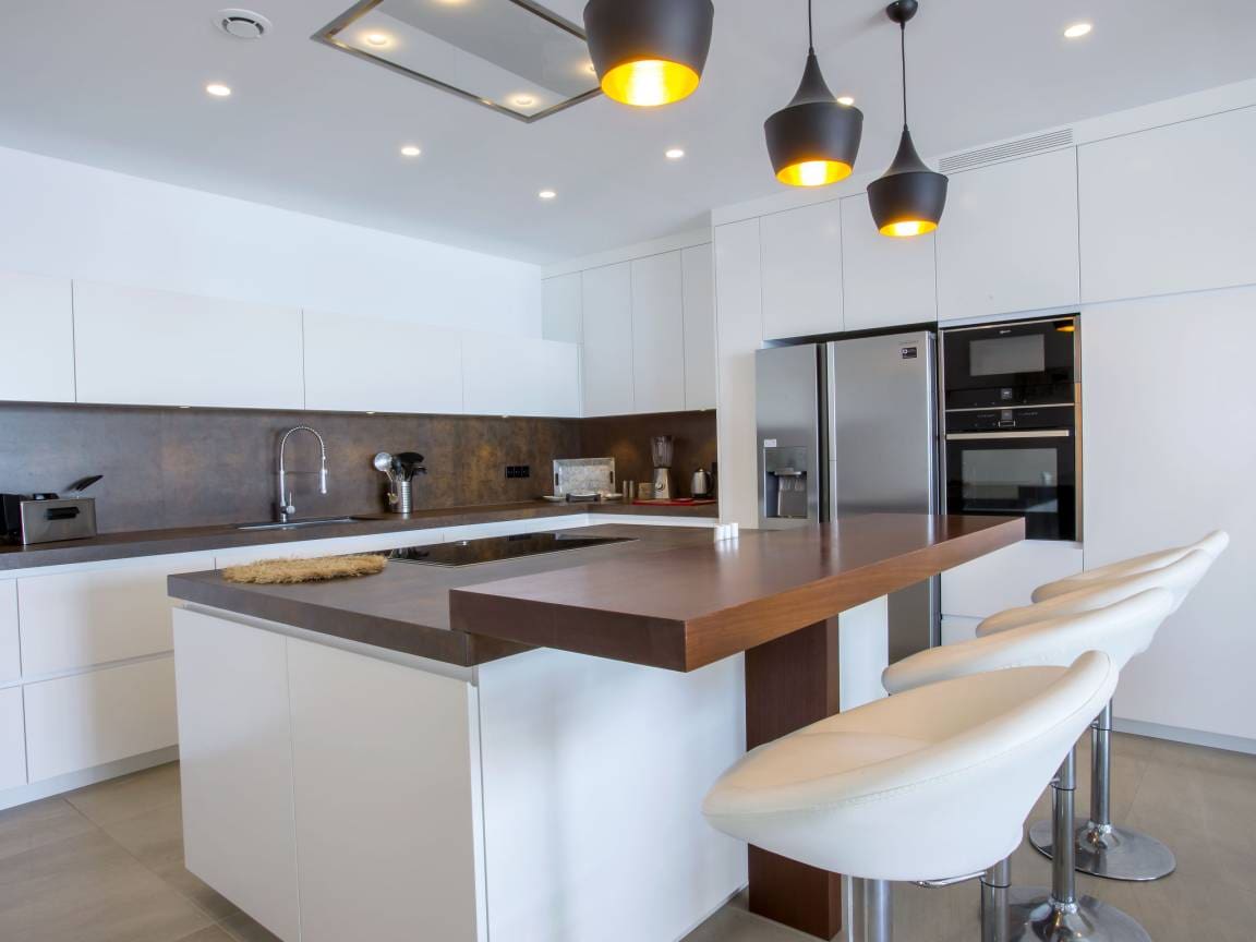 The villa’s fully equipped kitchen is designed for culinary excellence. Featuring high-end appliances—including oven, dishwasher, induction hobs, microwave, freezer, kettle, toaster, and electric coffee machine—the space offers everything needed for gourmet cooking. A central island adds both function and style, while an adjoining shower and WC provide convenient access from the main living areas.