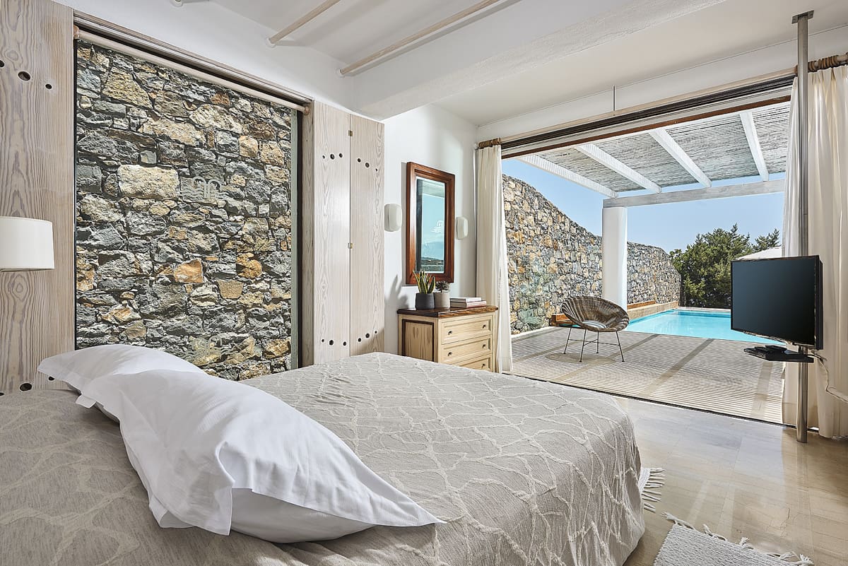 The villa is part of the Thalassa Luxury Villa Complex, which means you get the best of both worlds – your own private home from home and full use the extensive facilities, including a spa and restaurants. Alternatively, you can stay at the villa and appreciate the focus on modern living, with slide-away doors that lead onto a private hydro-massage swimming and a peaceful garden terrace with chairs, a dining table and a BBQ. All these places are afforded ample shade thanks to the carefully considered architecture.