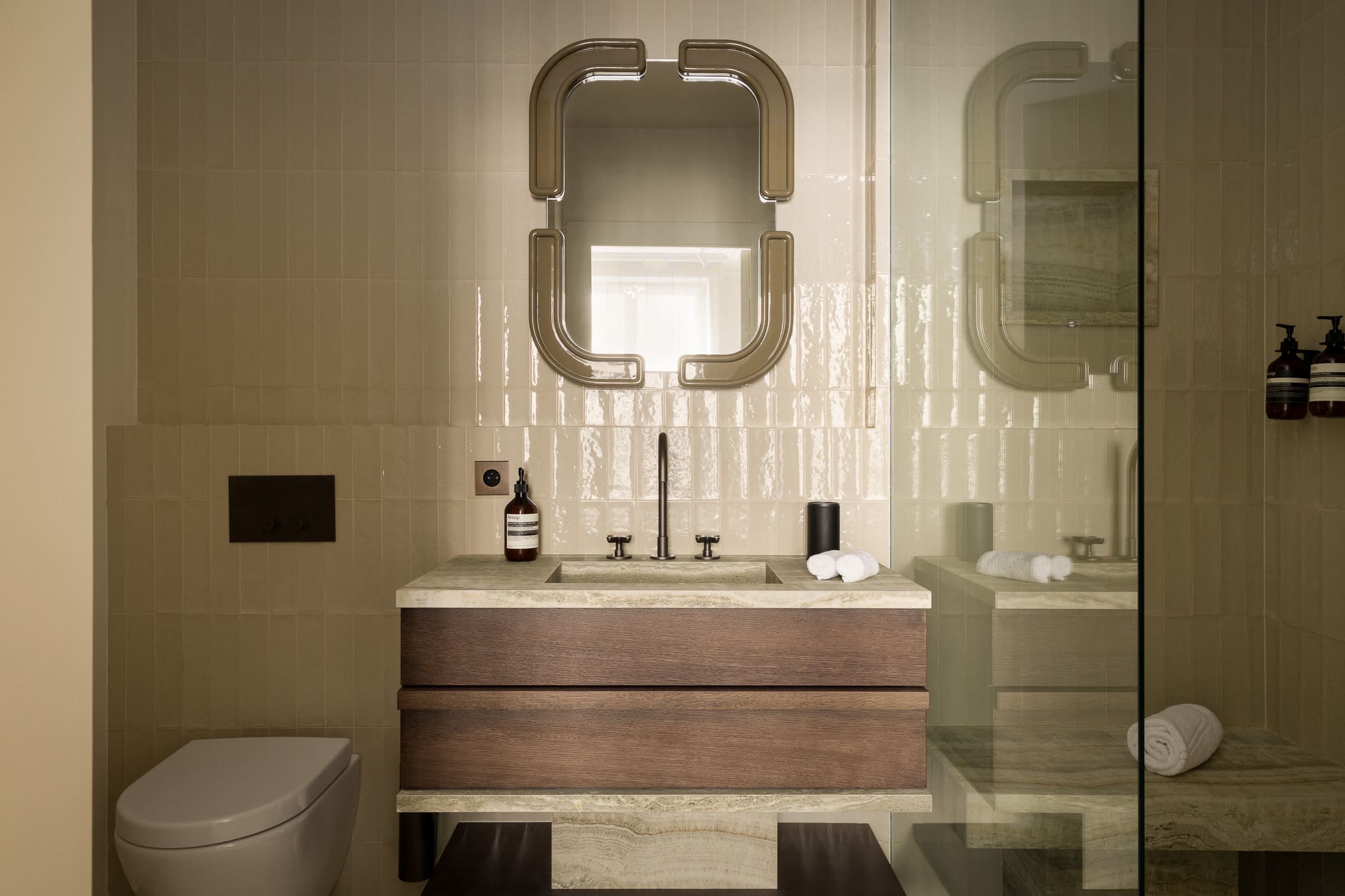Step into a world of refined sophistication as you enter this beautifully designed apartment. The interior effortlessly combines modern aesthetics with classic Haussmannian charm, creating a warm and inviting atmosphere. The open-plan living area is ideal for socializing, offering a comfortable sofa, chic chairs, and a dining table that doubles as a workspace, perfect for remote working. The two bedrooms are tastefully furnished, while the unique layout includes a separate WC, adding a touch of traditional French living.