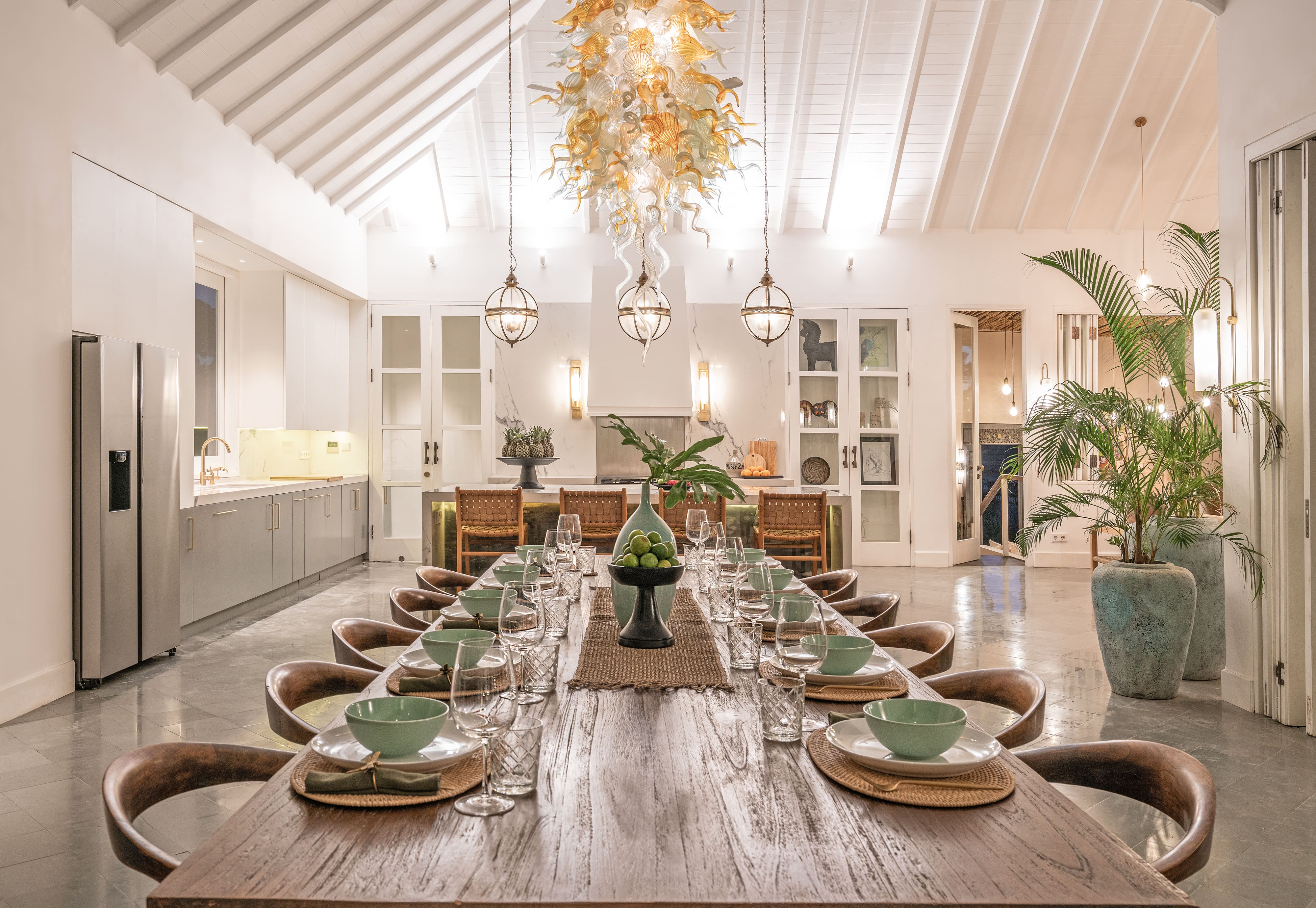 The villa’s interiors are a harmonious blend of traditional Balinese architecture and contemporary design. Each of the seven bedrooms is a sanctuary of comfort, featuring en-suite bathrooms and designed with intricate local artwork and materials. The spacious living area, bathed in natural light, is perfect for relaxation or entertainment, while the commercial-grade kitchen is a culinary enthusiast’s dream, staffed by four top-tier chefs ready to create a five-star dining experience.