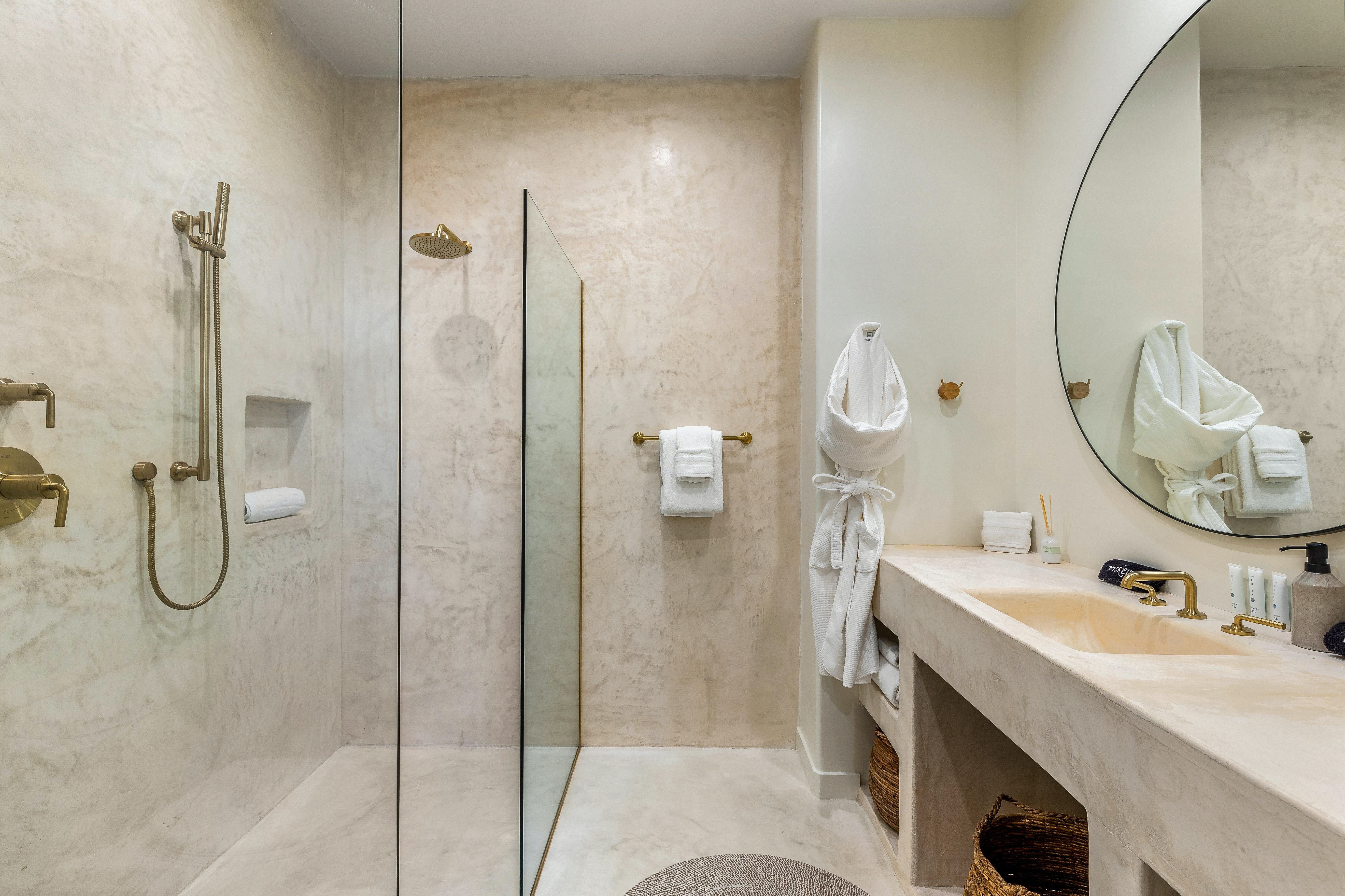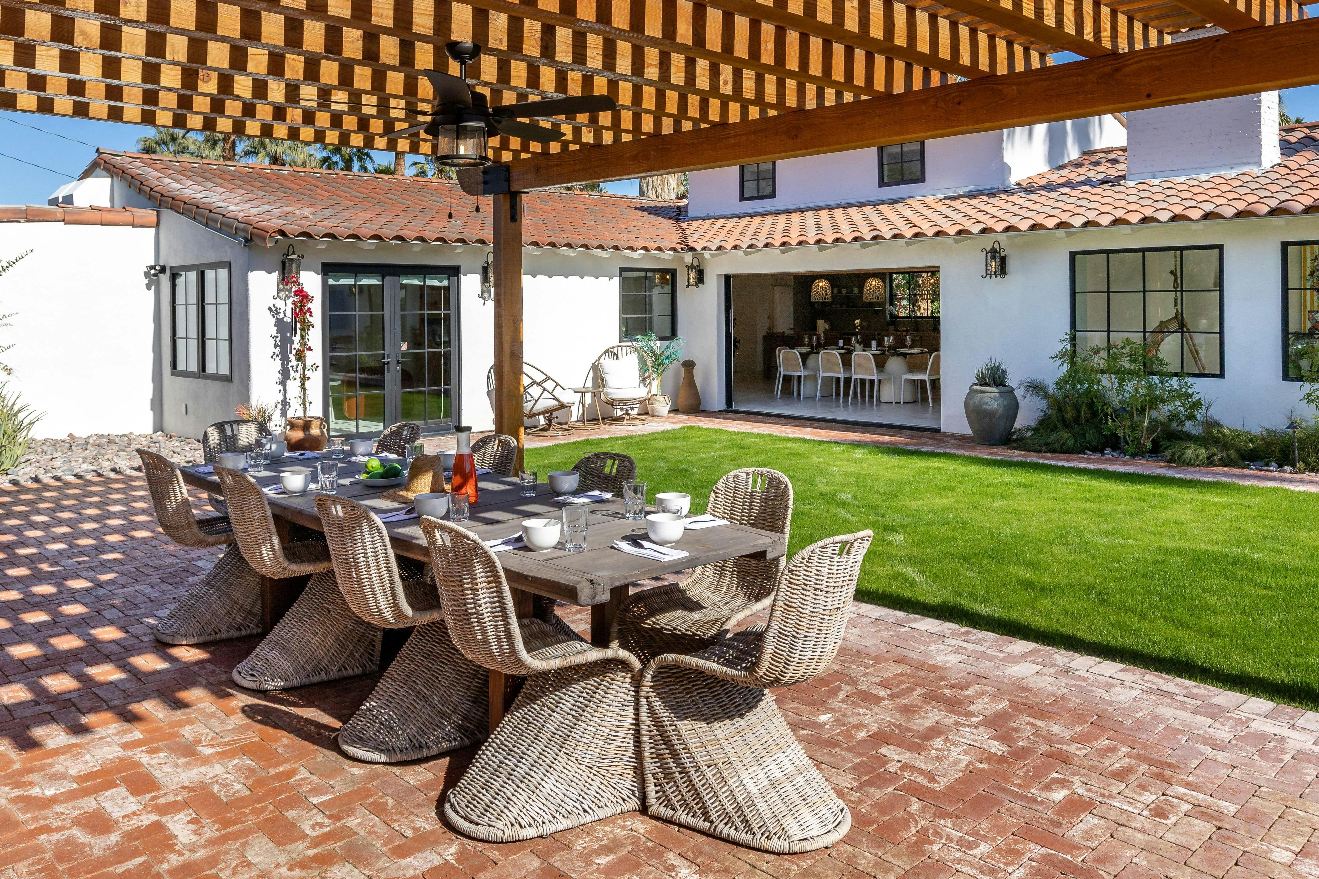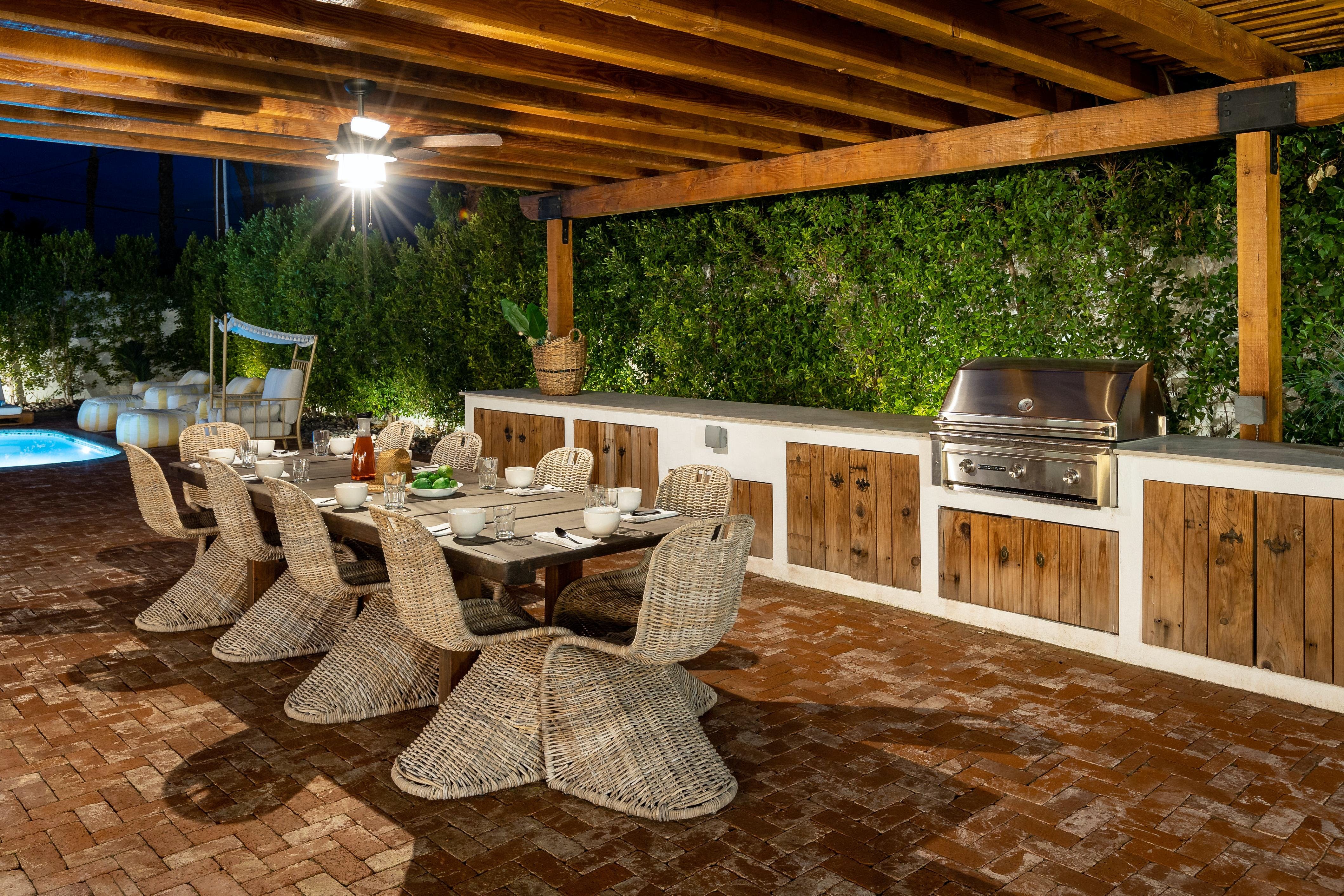 The outdoor spaces of this luxury apartment rental are nothing short of spectacular. A resort-style swimming pool and hot tub invite you to unwind under the sun, while multiple dining areas are perfect for alfresco meals beneath the starry desert sky. Surrounded by the breathtaking views of the rocky mountains and swaying palms, the backyard offers a tranquil escape.