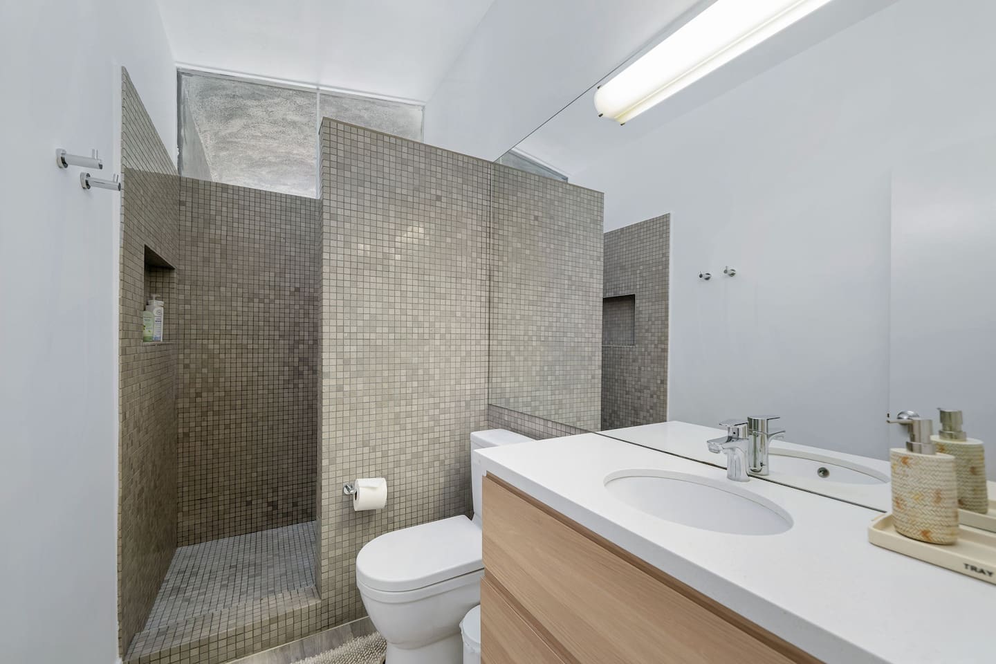 Surrounded by lush palm trees and breathtaking mountain views, the outdoor area is a serene oasis. The centerpiece is the pristine swimming pool, complemented by an integrated hot tub, where you can unwind under the Californian sun. Multiple sun loungers and outdoor seating areas provide ample space for relaxation and al fresco dining. The beautifully landscaped garden offers a tranquil setting for morning yoga or evening cocktails.