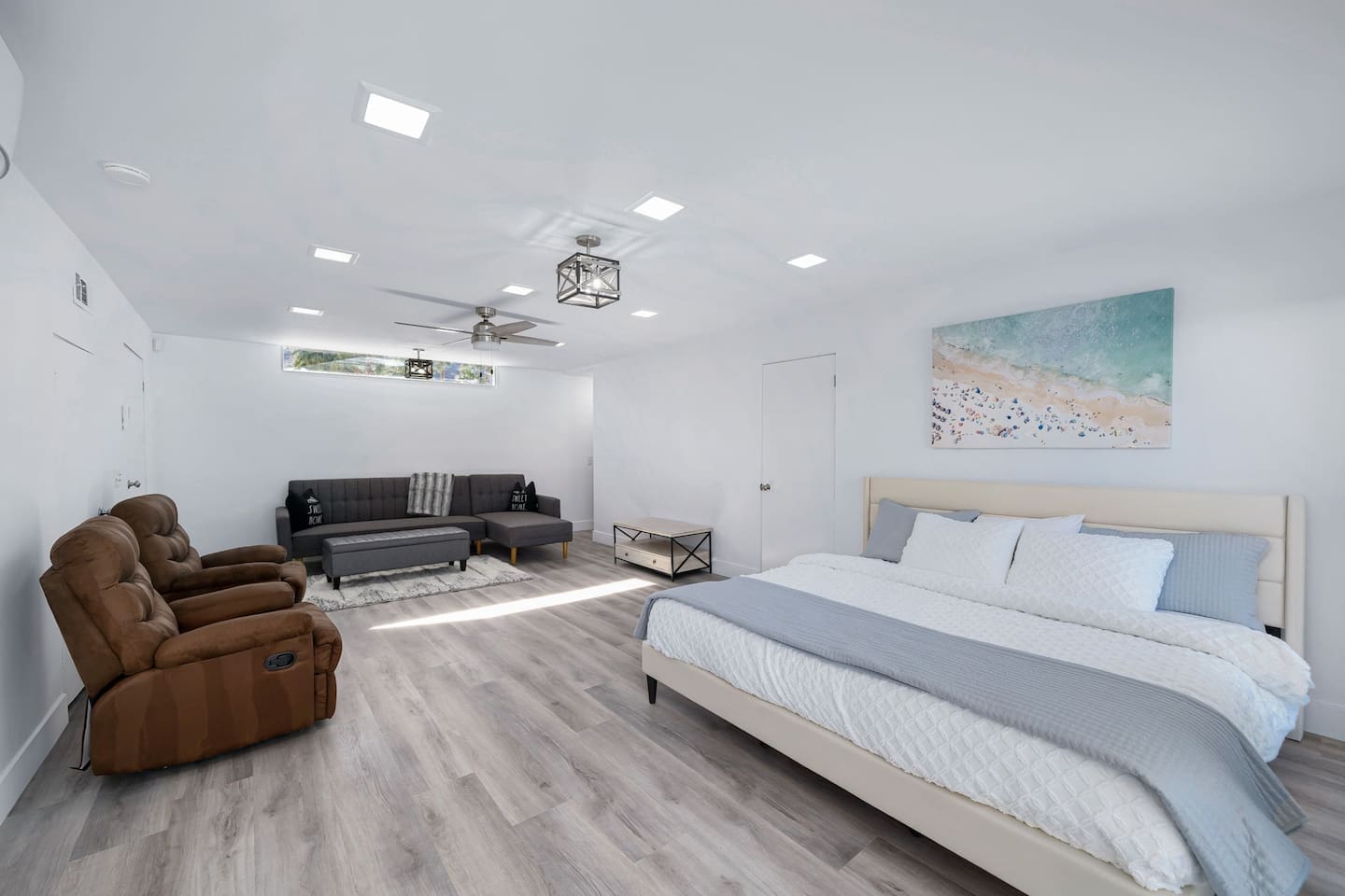 The property can accommodate up to 10 guests across five bedrooms and four bathrooms. The master suite, located in a private casita, features its own bathroom and bar area, offering additional privacy. The house is pet-friendly, allowing you to bring your furry friends along for the vacation. With all rooms on one level, it is accessible for wheelchair users and those with limited mobility. Private parking is available, and a car is recommended for exploring the area. Browse our luxury villa rentals in United States for more options.