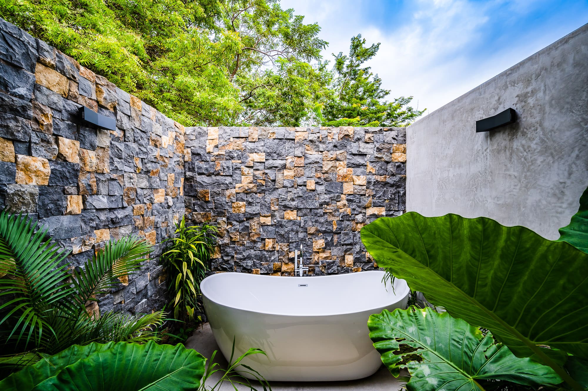 The villa’s outdoor area is a tropical paradise in itself. Dive into the private swimming pool or unwind in the hot tub, all while enjoying panoramic sea views. The surrounding terrace, outfitted with lounge chairs, provides an idyllic spot for sunbathing. A covered dining area invites you to savor alfresco meals amidst the gentle ocean breeze.