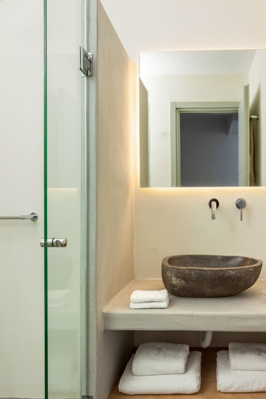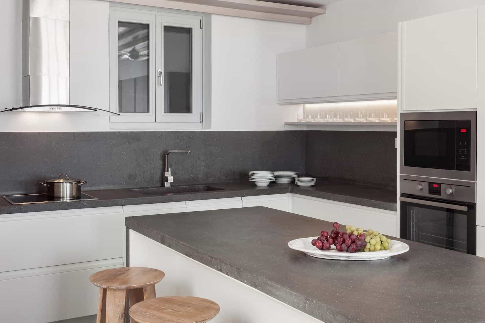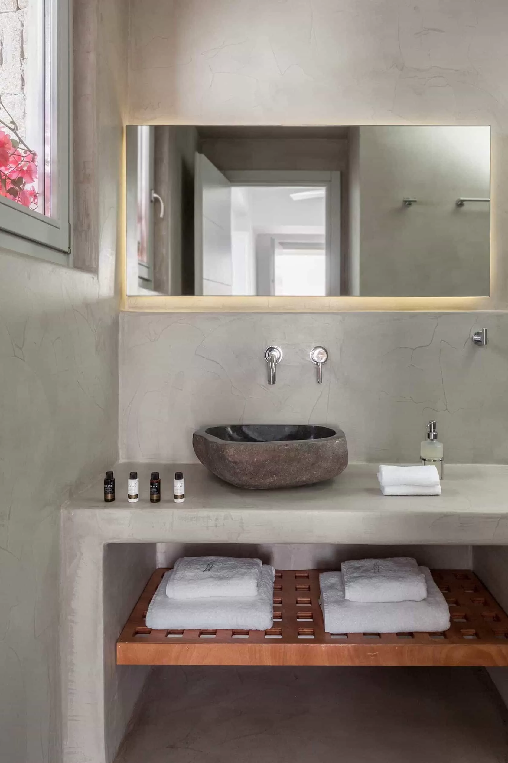 Step into a world of sophistication as you enter the grand interior of this Mykonos villa. Each of the two connected villas spans three levels, featuring 14 sumptuous bedrooms and 16 lavish bathrooms, all designed with minimalist elegance and comfort in mind. The open-plan living areas boast traditional beamed ceilings and polished concrete floors, complemented by plush furnishings that invite you to unwind. The villa’s fully equipped kitchens are a culinary enthusiast’s dream, perfect for preparing feasts or simply enjoying morning coffee with a view.