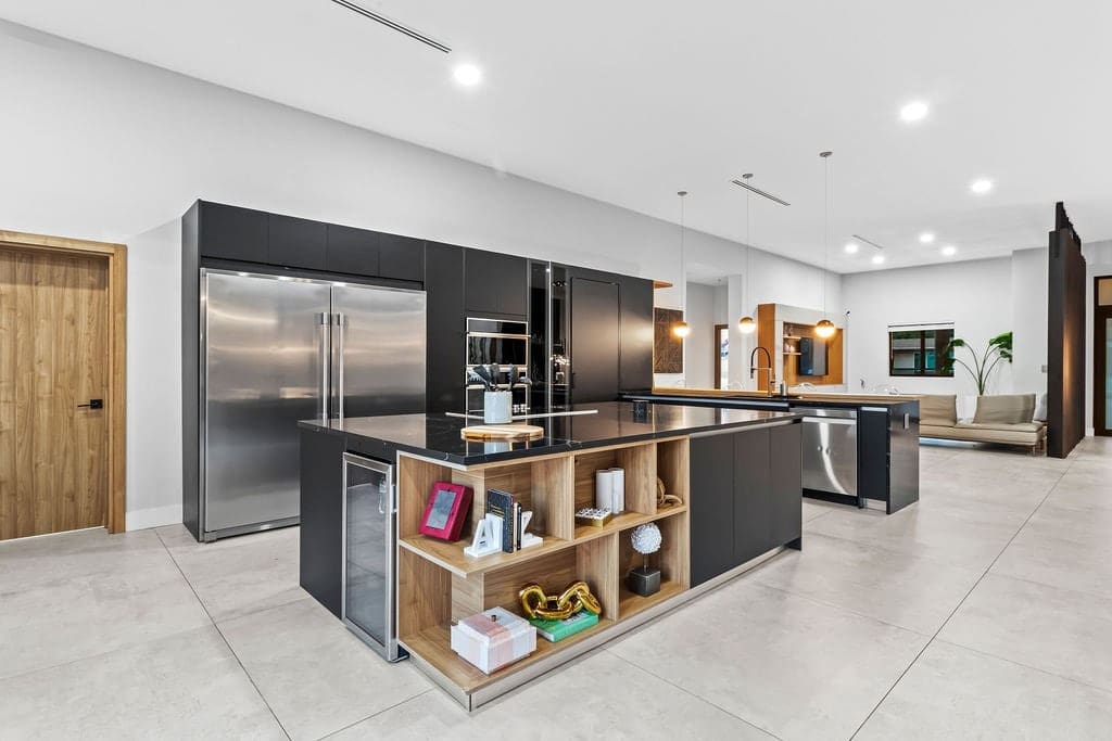 This Hollywood house is designed with a contemporary flair, featuring open-plan spaces that seamlessly blend indoor and outdoor living. The expansive living area is bathed in natural light, creating a warm and inviting atmosphere. The state-of-the-art kitchen is equipped with top-of-the-line appliances, perfect for preparing gourmet meals. Five elegantly appointed bedrooms provide ample space for relaxation, each with its own en-suite bathroom. While the fifth bedroom isn’t pictured, it matches the home’s high standards of style and comfort.