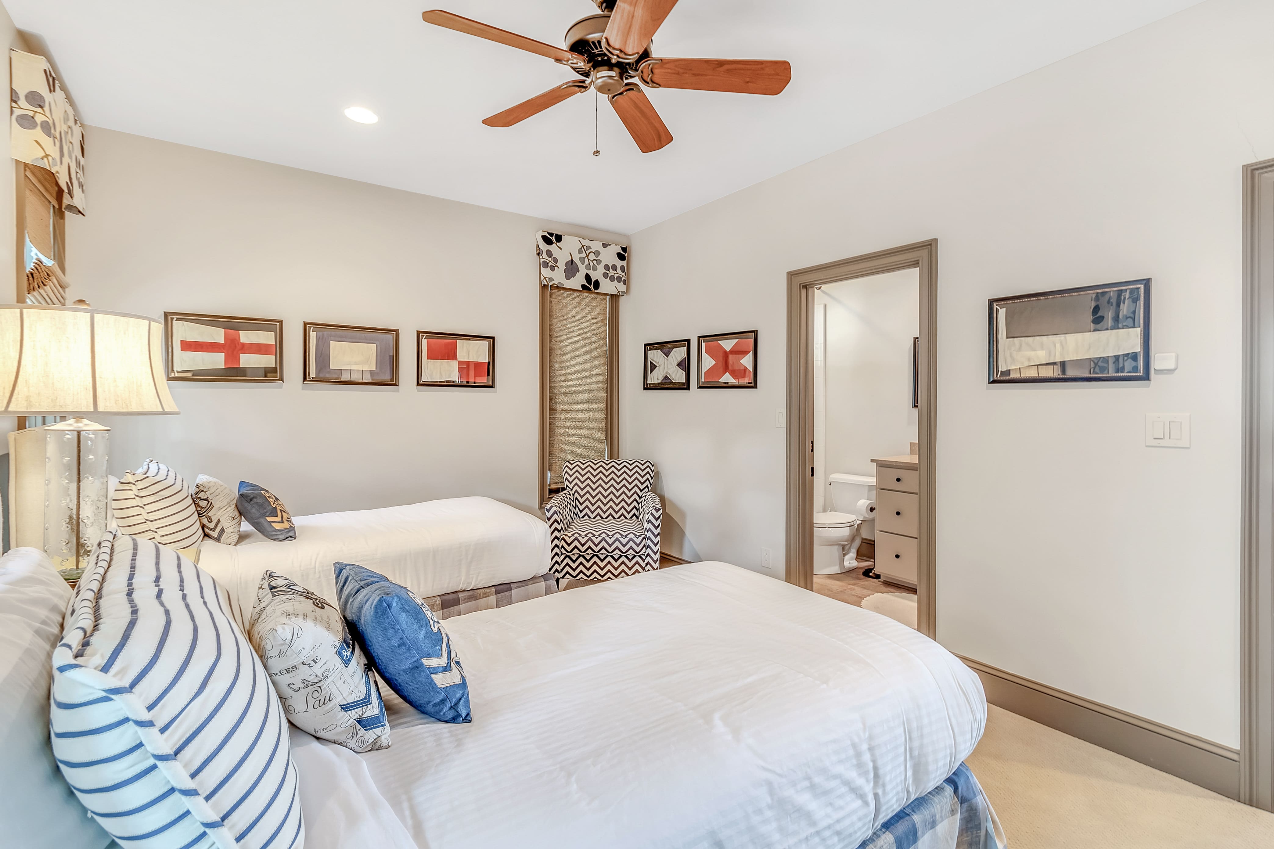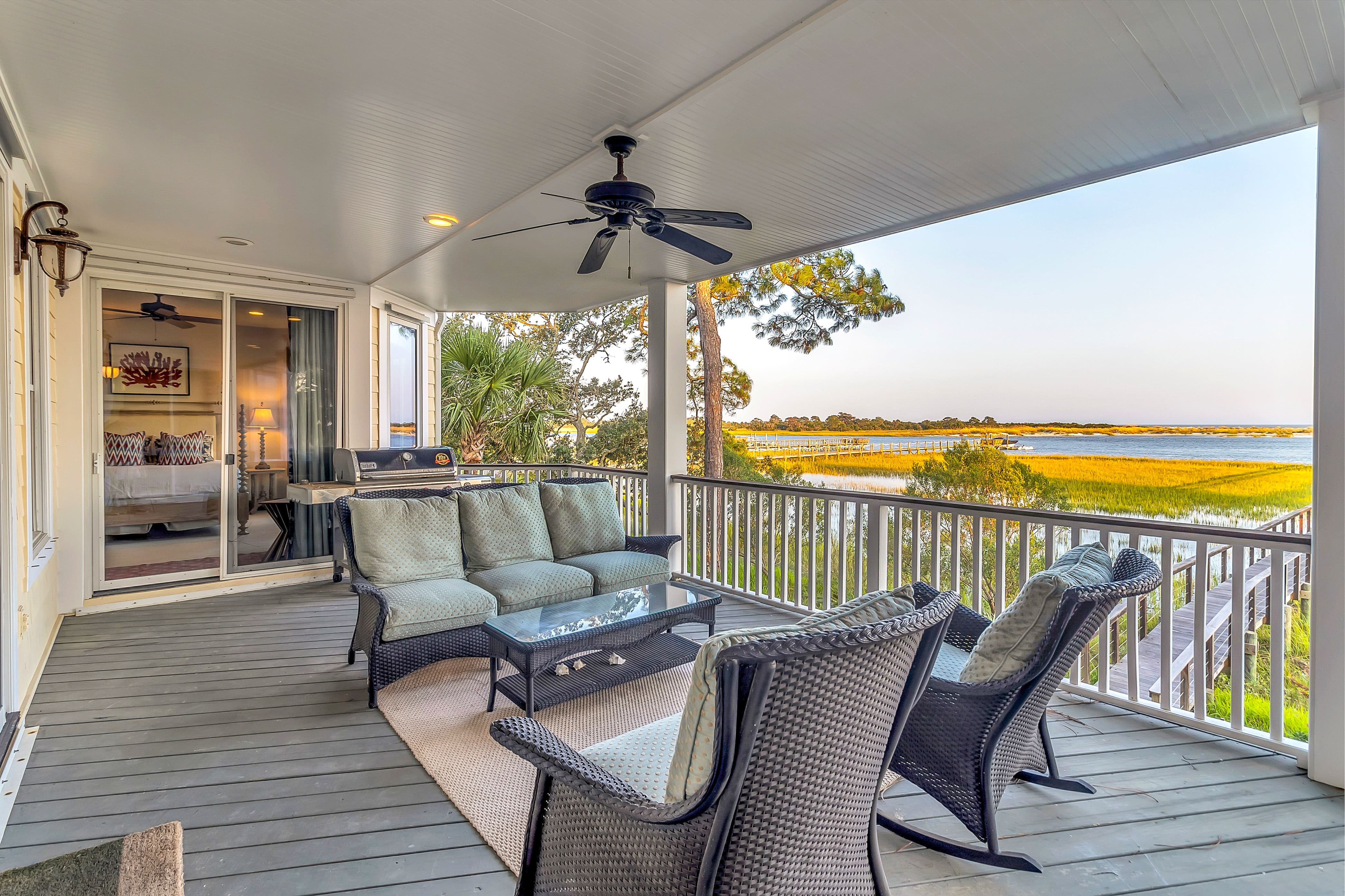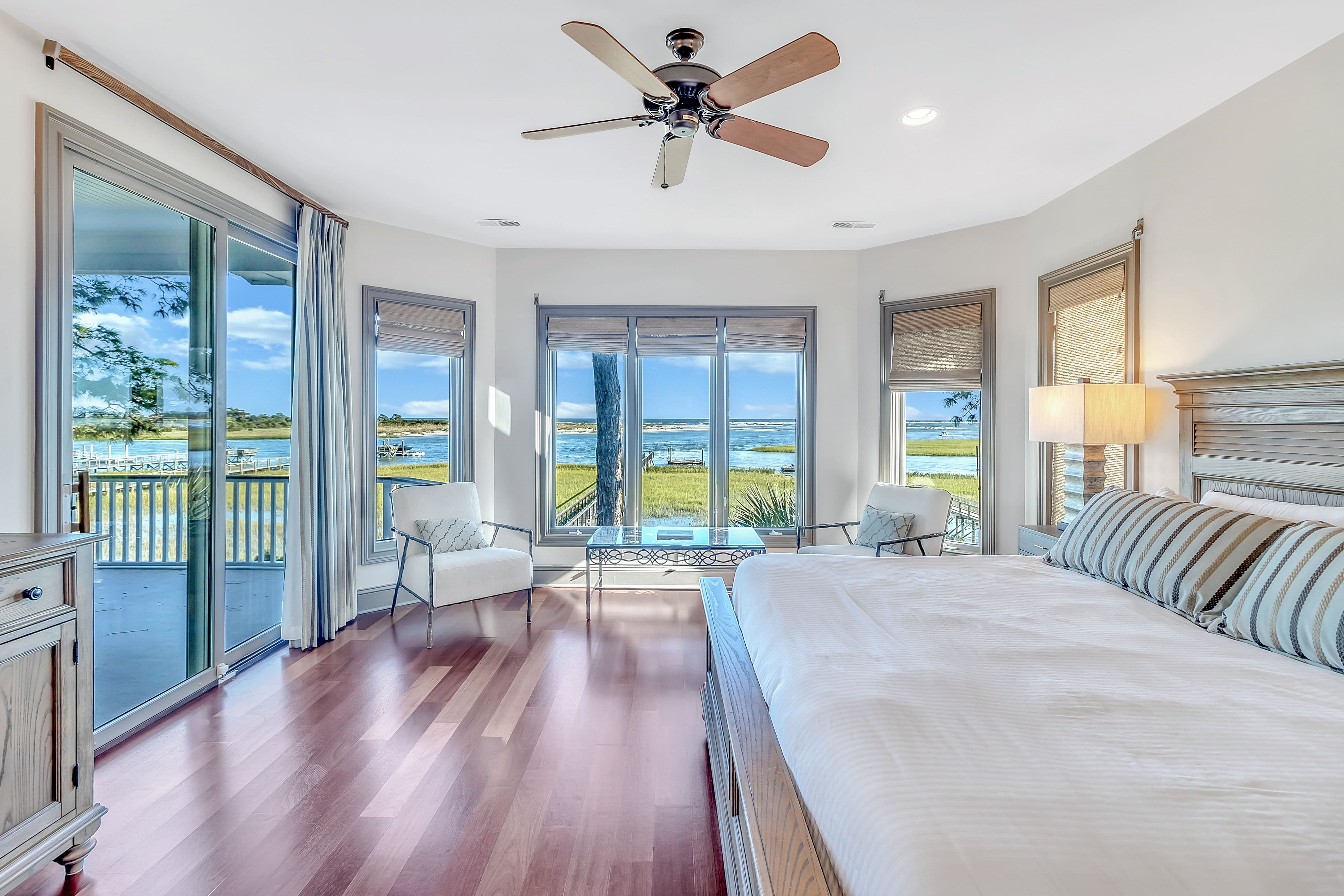 Step inside this sophisticated villa and be greeted by a harmonious blend of understated luxury and contemporary design. The open-plan living area on the top floor offers panoramic views of the Kiawah River, while the elegant dining space is perfect for entertaining. The well-equipped kitchen features state-of-the-art appliances, making meal preparation a breeze. Each of the four bedrooms offers plush bedding and en-suite bathrooms, ensuring comfort and privacy for all guests. A unique feature includes one room with a daybed and trundle, ideal for accommodating two additional guests, perfect for children.