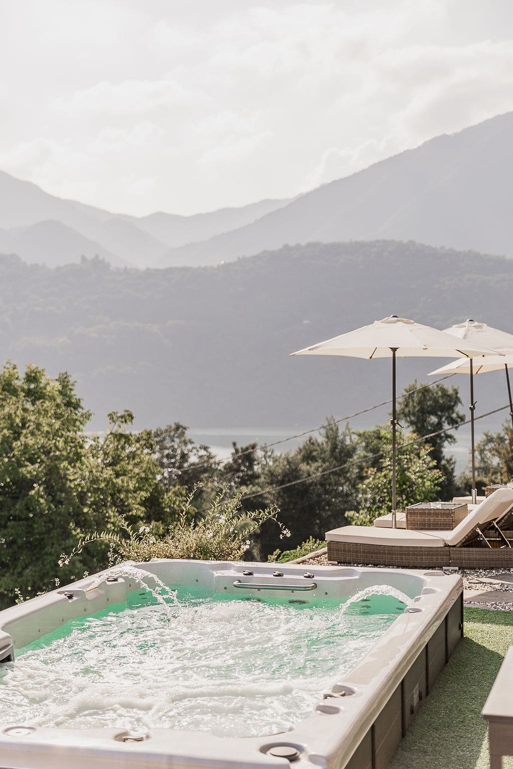 Soak up the sun and enjoy the tranquil surroundings in the shared outdoor spaces, featuring a shimmering swimming pool, inviting hot tub, and a private beach along the lake’s edge. Whether lounging on the lakeside sun loungers or enjoying a candlelit dinner on the terrace, the outdoor areas offer a perfect blend of leisure and luxury, set against the stunning backdrop of Lake Maggiore.