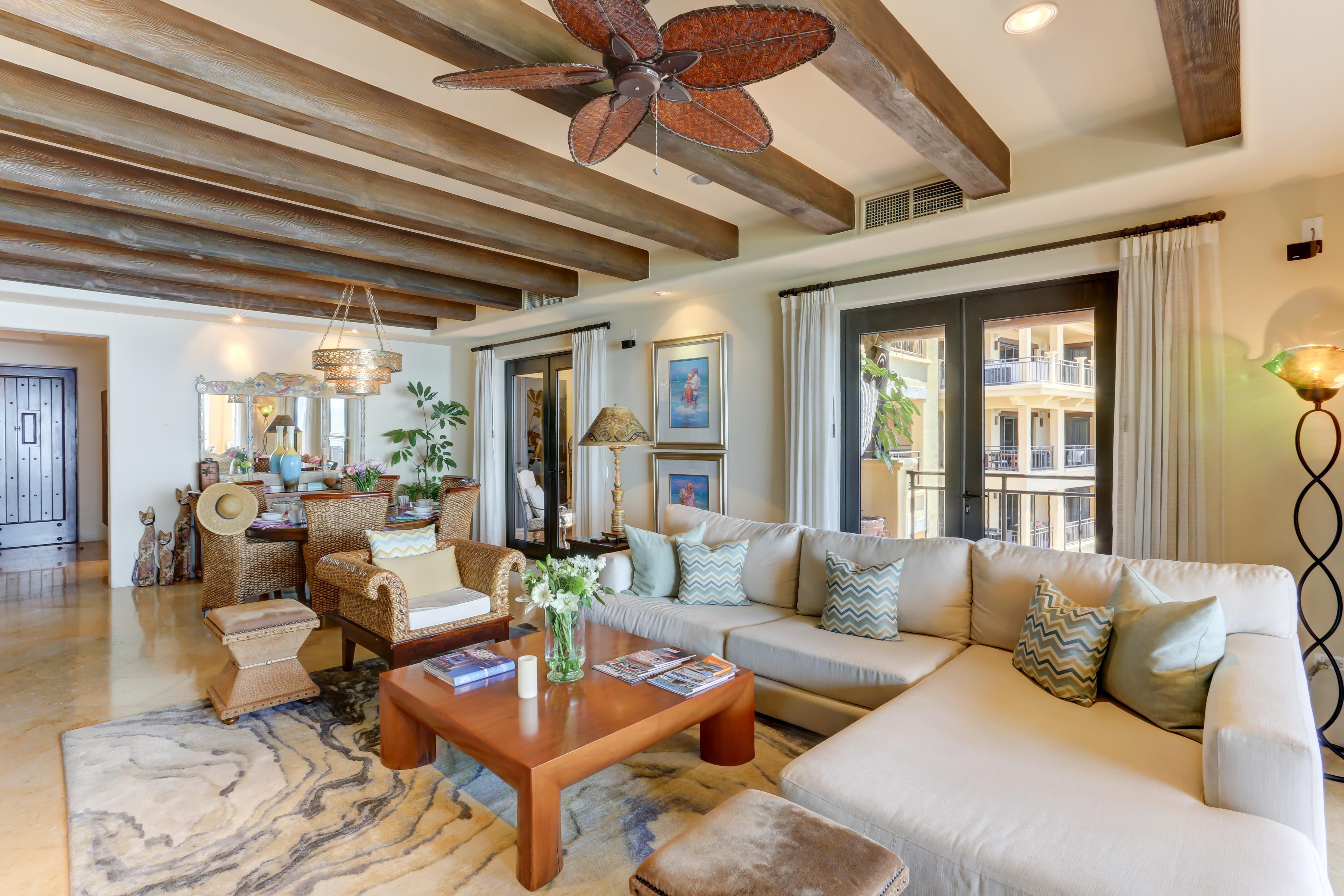 Step into elegance and sophistication inside this Cabo San Lucas apartment. The open-plan living area features expansive glass walls that invite natural light and offer breathtaking views of the ocean. Exposed wooden beams and artisanal Mexican decor create an ambiance of timeless luxury. With four beautifully appointed bedrooms, including two with direct patio access, guests can enjoy serene mornings with undulating sea views. The dining area, perfect for convivial gatherings, also doubles as a convenient workspace for those who need to stay connected.