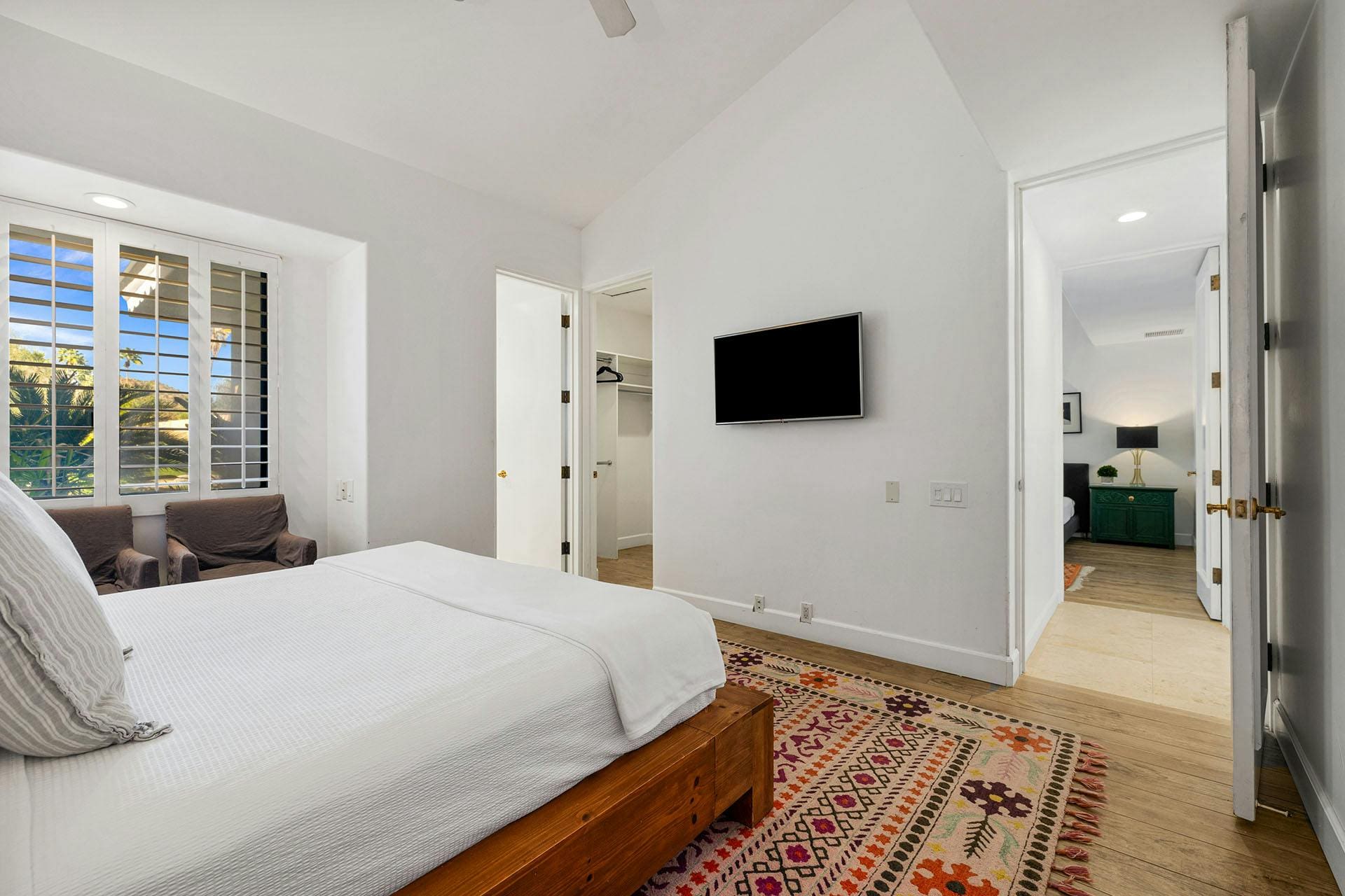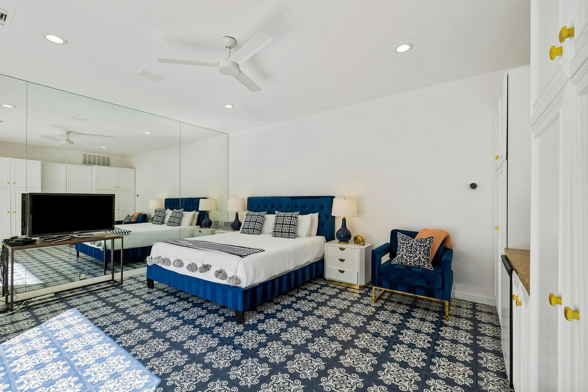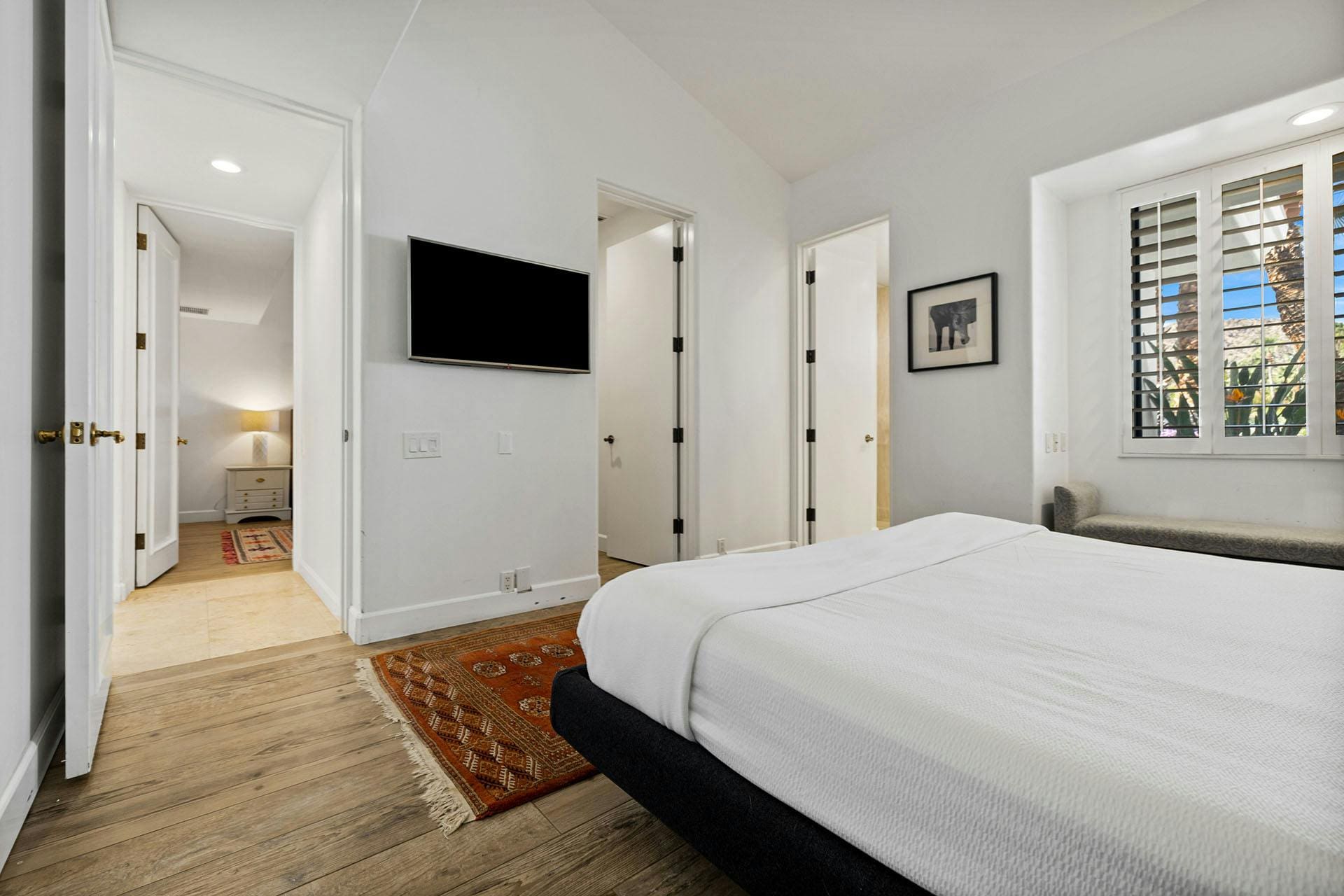 The interior of this Palm Springs villa showcases a seamless fusion of modern design and comfort. Expansive glass walls flood the open-plan living spaces with natural light, creating a warm and inviting atmosphere. The chef’s kitchen, complete with state-of-the-art appliances, is perfect for culinary enthusiasts. With five spacious king-size bedrooms, including a separate casita suite with its own kitchenette and bathroom, each guest can enjoy a personal haven of relaxation.