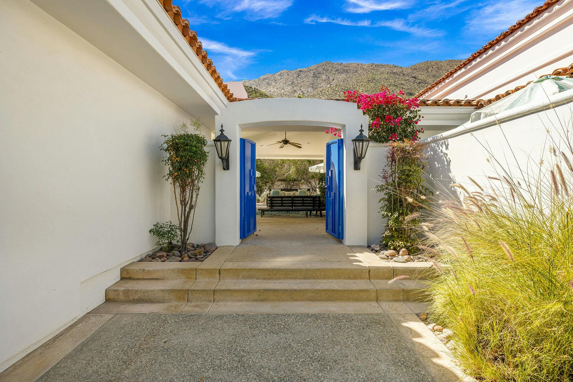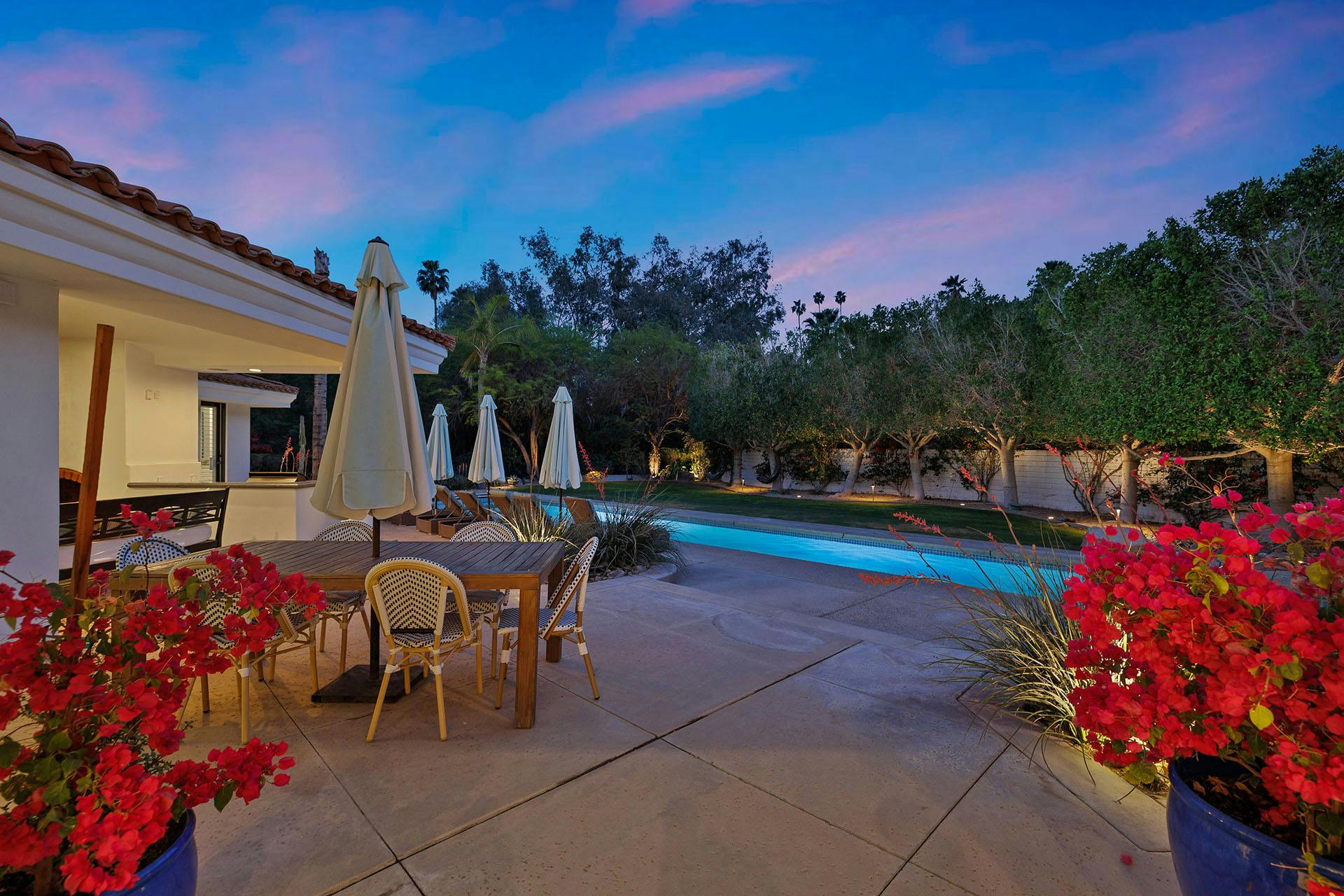The outdoor area is a true highlight, featuring a sparkling swimming pool and a separate spa, both set against the stunning backdrop of the surrounding mountains. The outdoor living room, complete with a cozy fireplace, provides an ideal spot for evening gatherings under the stars. Unwind in the beautifully landscaped gardens or enjoy alfresco dining on the terrace, soaking in the tranquil Palm Springs ambiance.