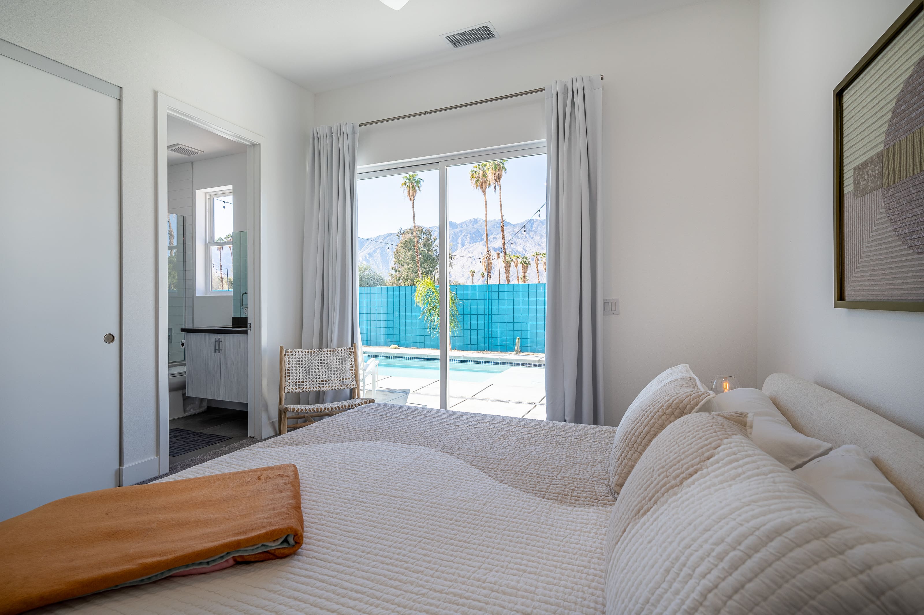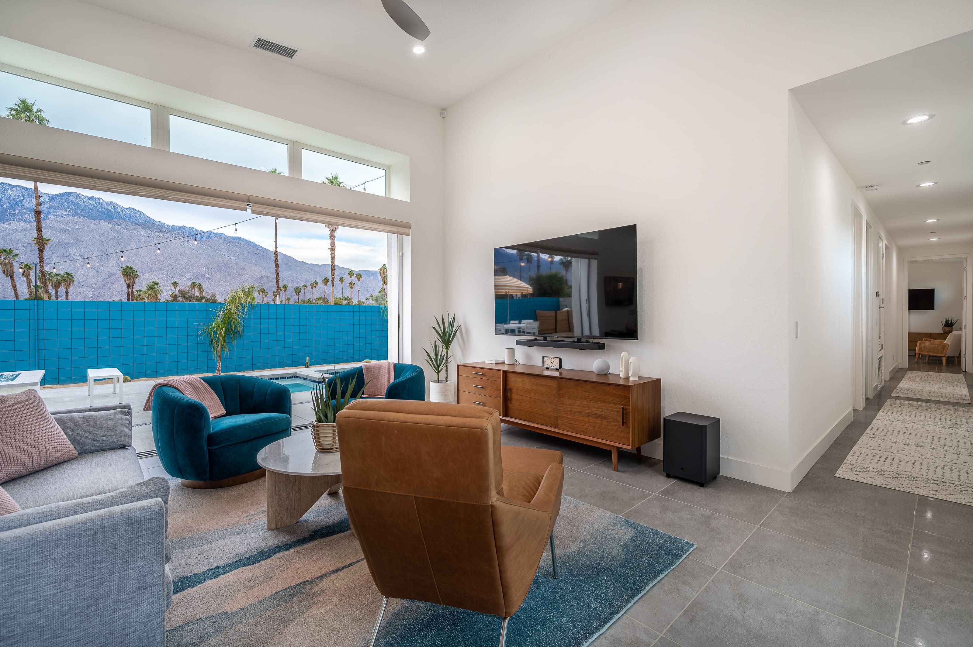 The villa’s outdoor area is a haven of tranquility, featuring a private swimming pool and a hot tub, perfect for unwinding under the clear desert skies. Enjoy alfresco dining on the spacious patio, surrounded by the stunning mountain views unique to Palm Springs. Whether lounging by the pool or enjoying a quiet evening by the fire pit, this outdoor space is designed for ultimate relaxation and entertainment.