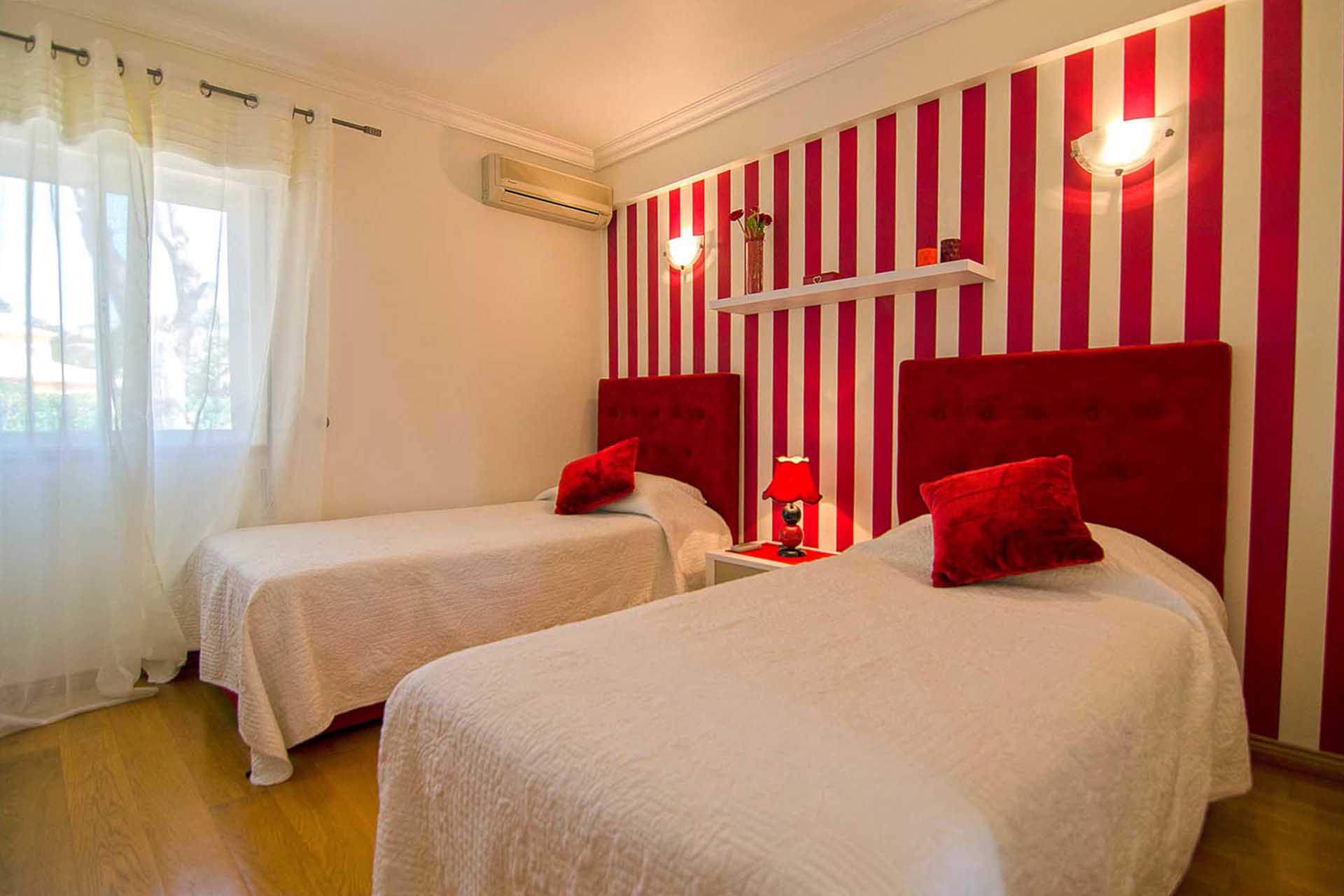 As you enter the premises, the villa is instantly showcased by a long-cobbled pathway leading to the front door, surrounded by a forest-like front garden. Entering the villa, you are welcomed by a large living room that is furnished with two large sofas, a recliner, flat screen television and offers a panned perspective of the garden. The polished floors continue into an equally large dining space, that will effortlessly seat all your guests. If you’re looking to have a more intimate meal, the fully furnished kitchen has a small table, ideal for those who are after a quick snack. The ground floor is concluded by three En-suite bedrooms, one with a double bed and the other two with two twin beds. The master En-suite double bedroom can be found by using the twisting staircase, which will take you onto the first floor. This is a large bedroom with access to another small single bedroom, ideal for those with young children. The master bedroom has access to a lengthy balcony, where you can see the swimming pool and the immaculately kept sixth fairway.
