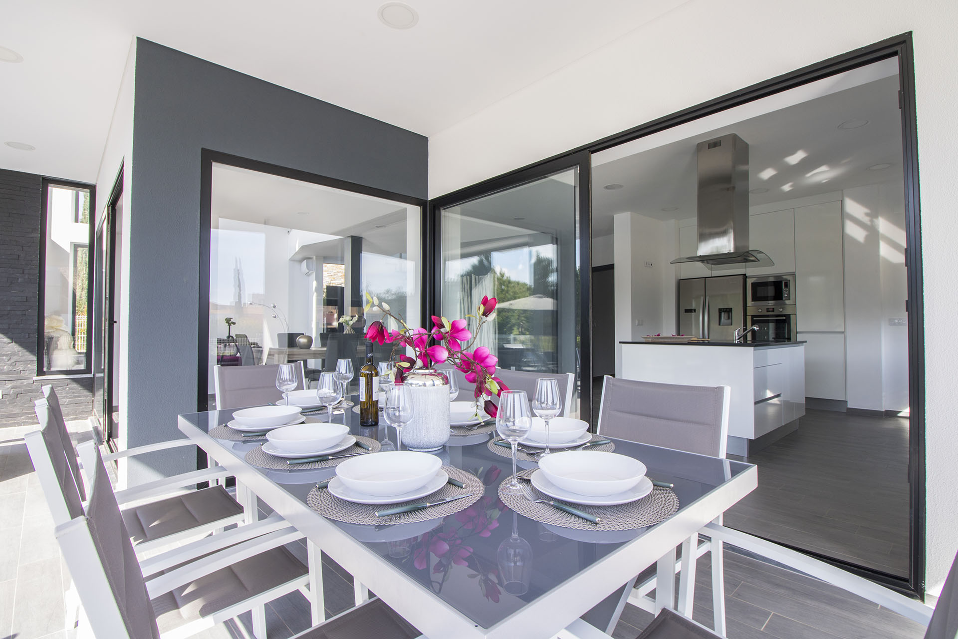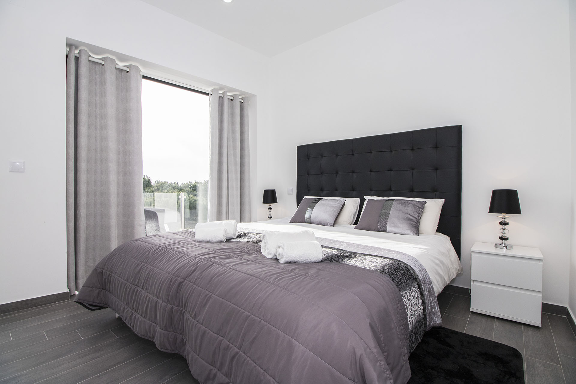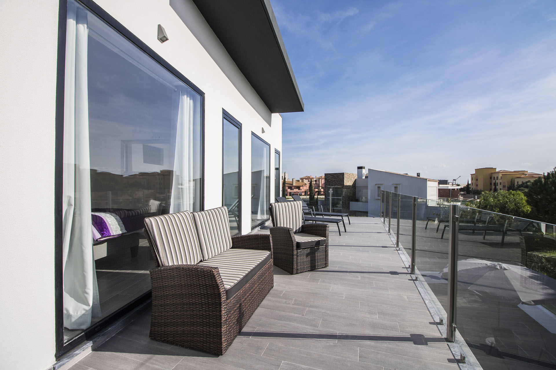 Before entering the villa, you will immediately notice the enormous glass panelled windows that allow a rich source of natural light to flood this contemporary luxury holiday home. The interior really benefits from this, as it’s incredibly spacious open plan living and dining areas make you feel as if you are in a villa twice the size. The kitchen, as suspected, is fully equipped with all the latest gadgets to ensure you and your guests can whip up a superb feast. The ground floor is concluded with an en-suite double bedroom. Using the zig-zag staircase, you can access the first floor. Here you will find three sophisticated and stylish en-suite double bedrooms, two of which have access to exclusive balconies which are high enough up for you to be able to see for miles.