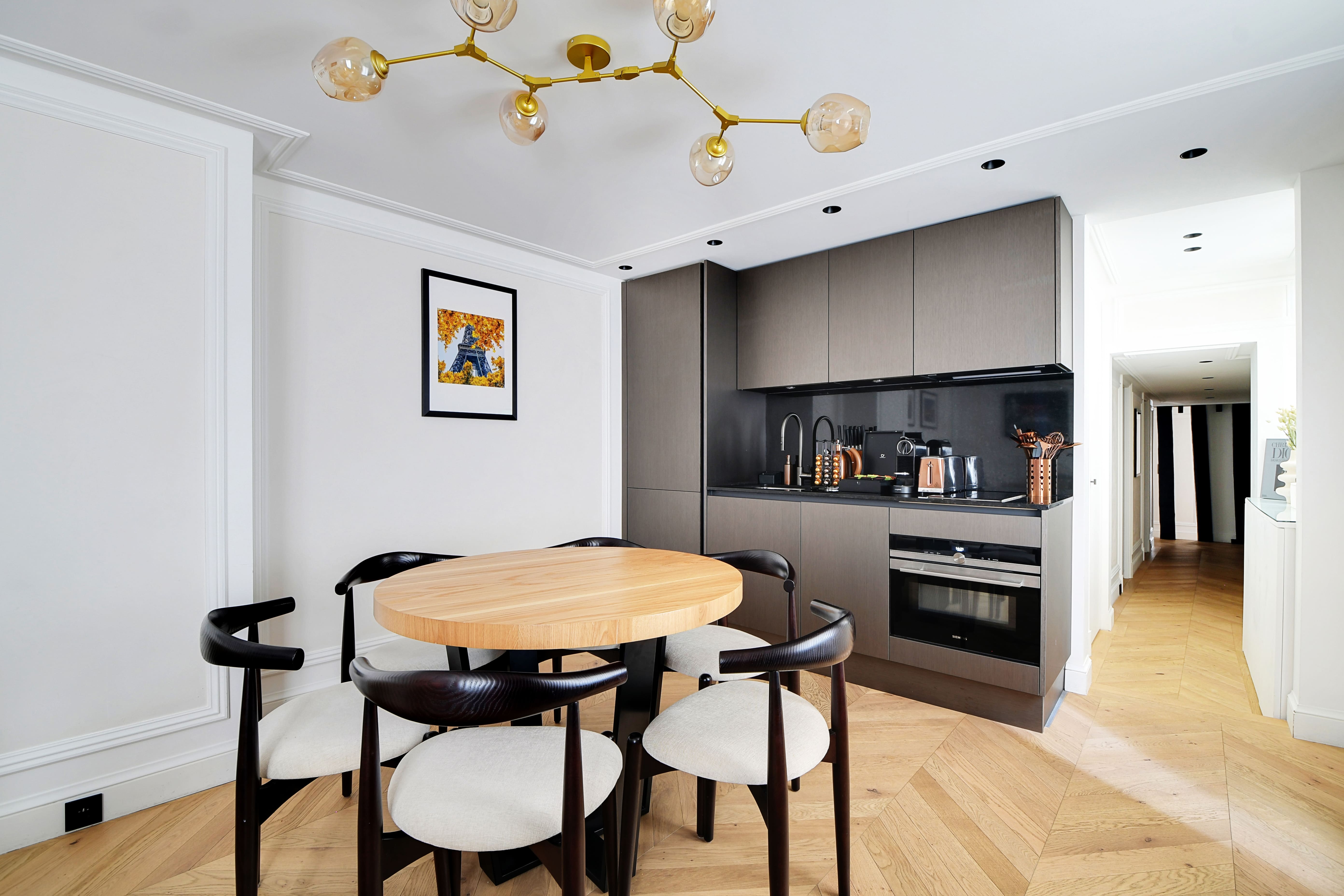 The apartment’s interior is a masterpiece of refined design, featuring muted tones, parquet floors, and contemporary abstract art. The open-plan living area is the heart of the home, boasting a plush sofa that invites you to unwind with a glass of French wine. The dining area is perfect for intimate meals, while the compact kitchenette is ideal for preparing light snacks. The two bedrooms are thoughtfully designed for comfort, each offering a serene retreat after a day exploring the city. The sleek stone bathrooms provide a spa-like experience with their modern amenities.
