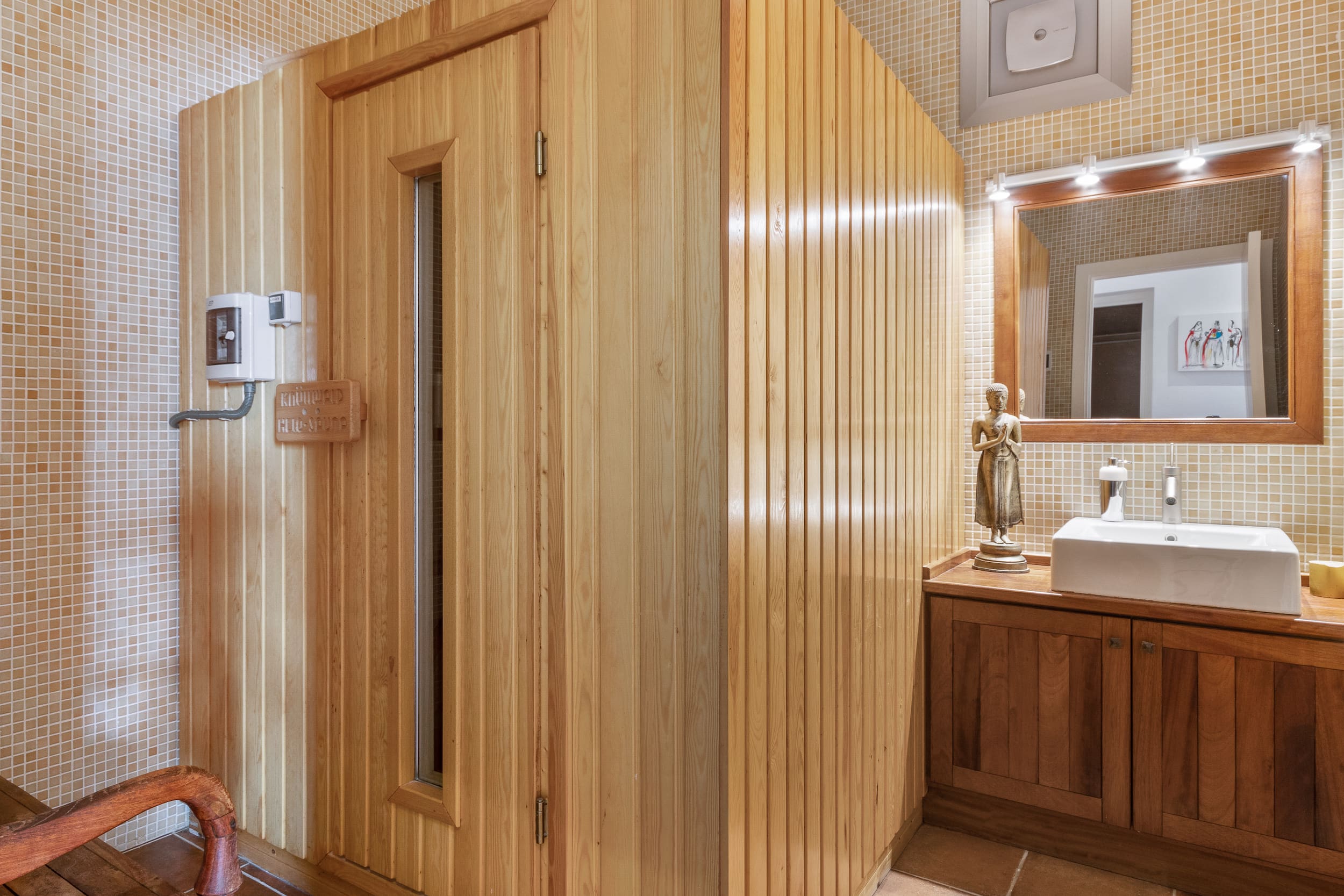 Step into a world of refined elegance as you enter this luxurious villa. The interior spaces are designed to impress with their contemporary style, featuring spacious living areas that open up to the outdoors, creating a seamless flow between inside and outside living. The villa includes five bedrooms in the main house, each with an en-suite bathroom, ensuring privacy and comfort for all guests. One bedroom features a Jacuzzi bath, while another offers a private sauna for ultimate relaxation. The fully equipped kitchen and two dining areas provide ample space for entertaining and enjoying culinary delights.
